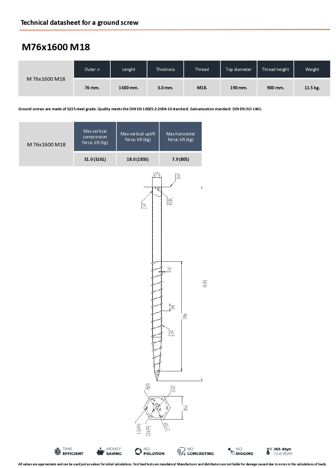 Siin on tabel Kruvivai M76x1600x3,0mm KZN. M18x190mm tehnilistest andmetest*