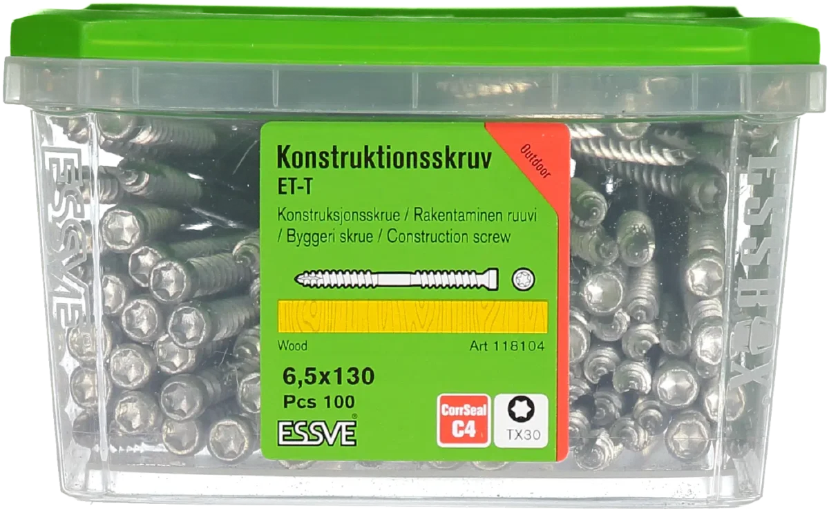 ESSVE konstruktsioonikruvi ET-T on mõeldud puidust detailide, puitkonstruktsioonide, liimpuidu jmt ühendamiseks sise- ja välistingimustes. ESSVE ET-T konstruktsioonikruvi monteerimisel välistingimustes peab puit olema kuiv ja jäävaba.