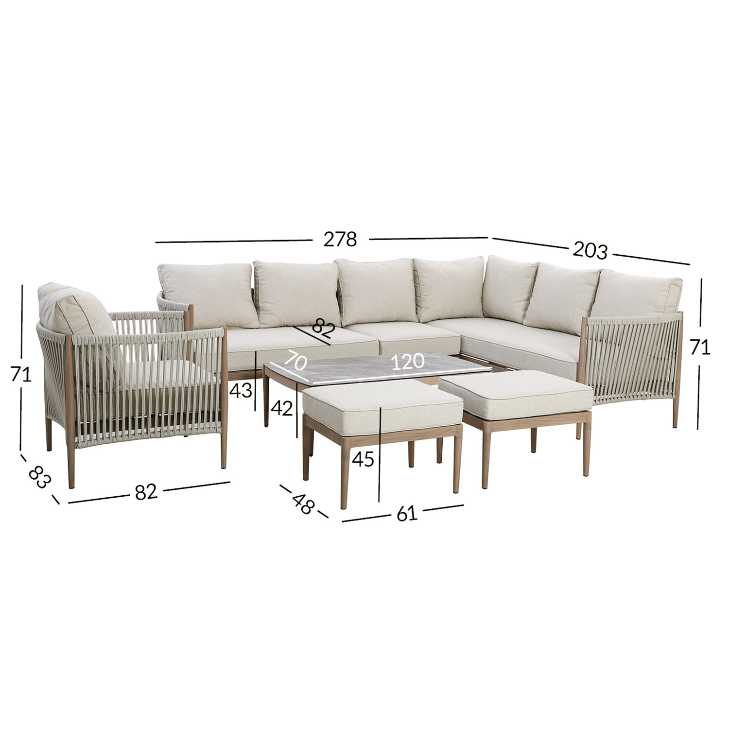 Nurgadiivani üldmõõdud: 278 x 203 x H71 cm. Istme kõrgus raami ääreni 29 cm.