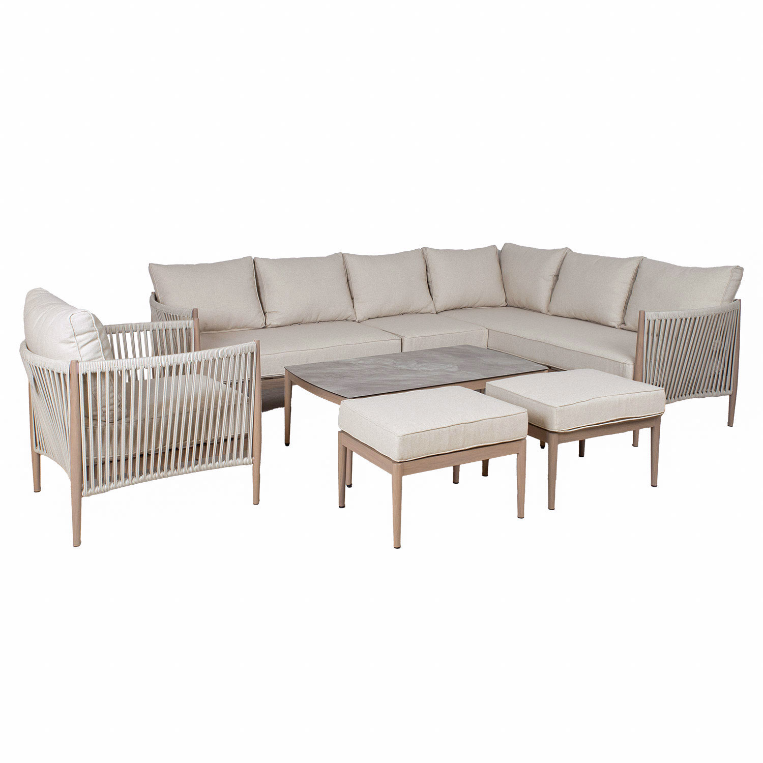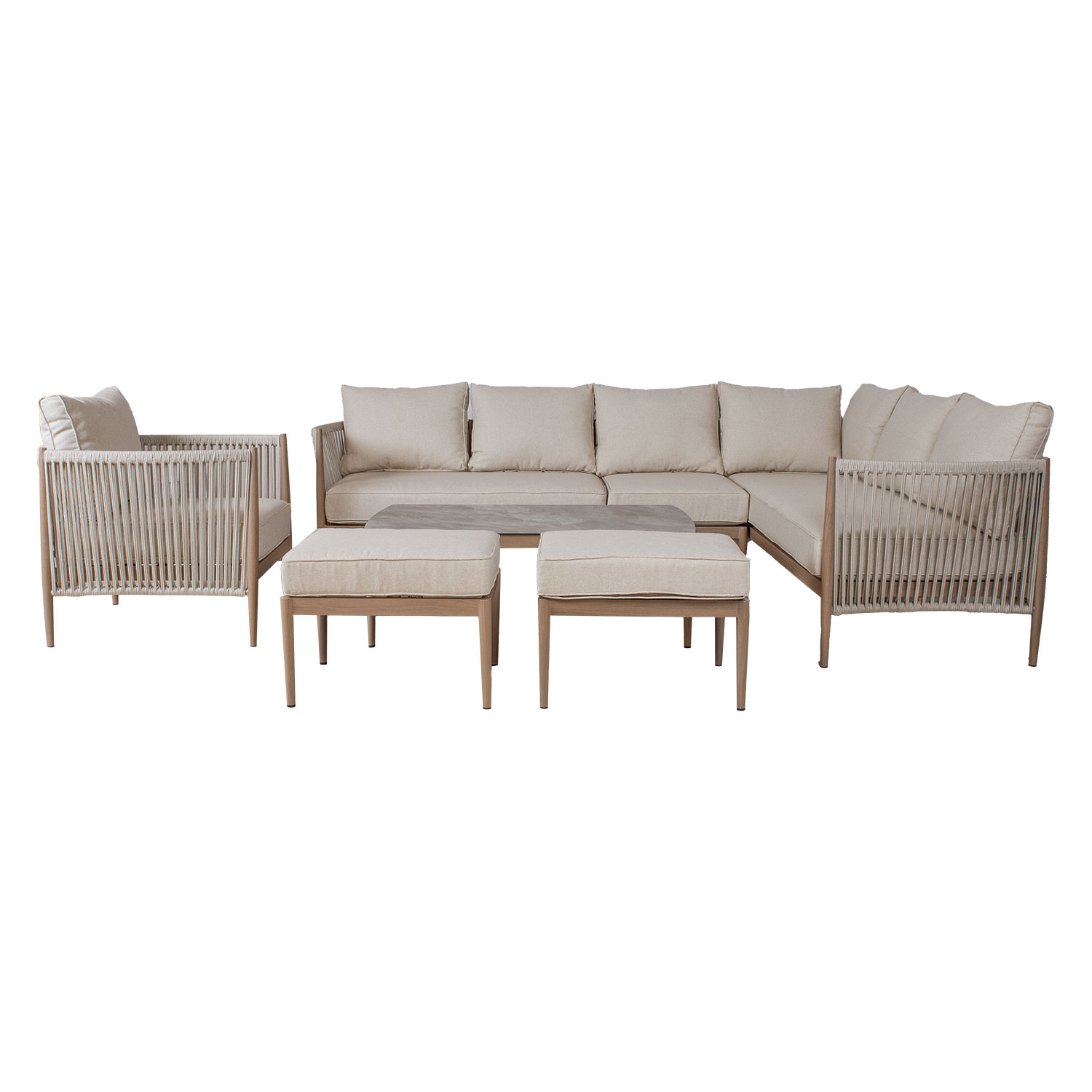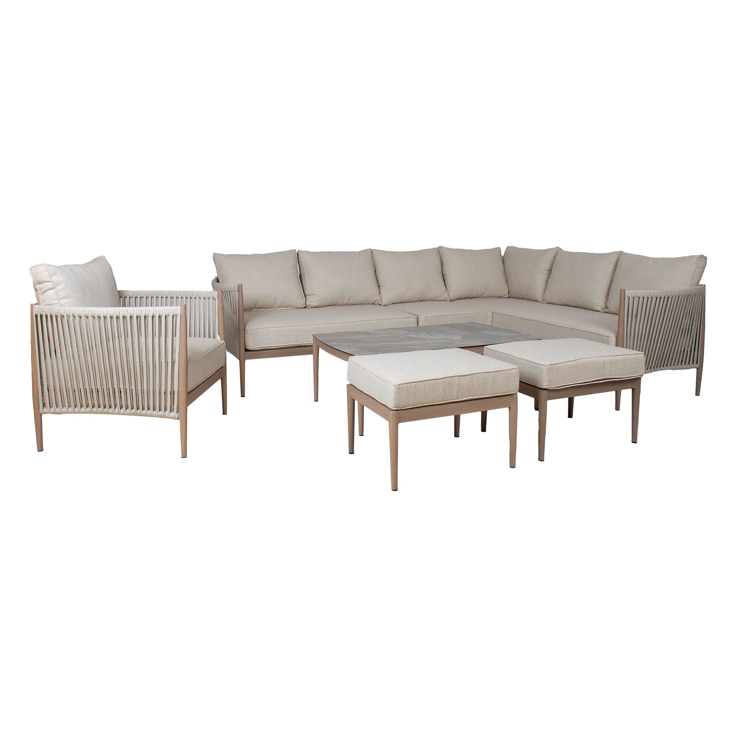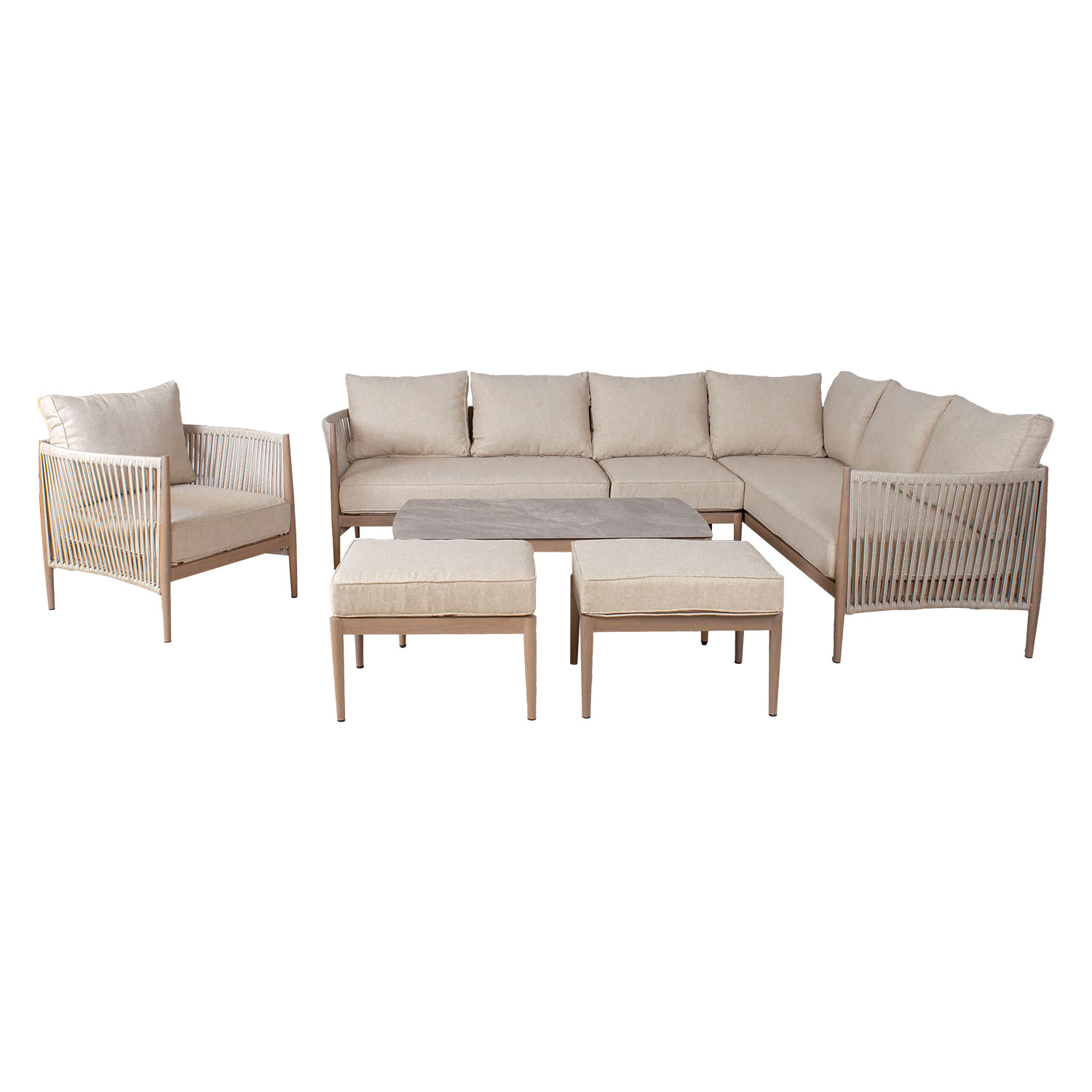 Aiamööblikomplekt MEDINA nurgadiivan, tugitool, 2 tumbat ja diivanlaud, beež.
