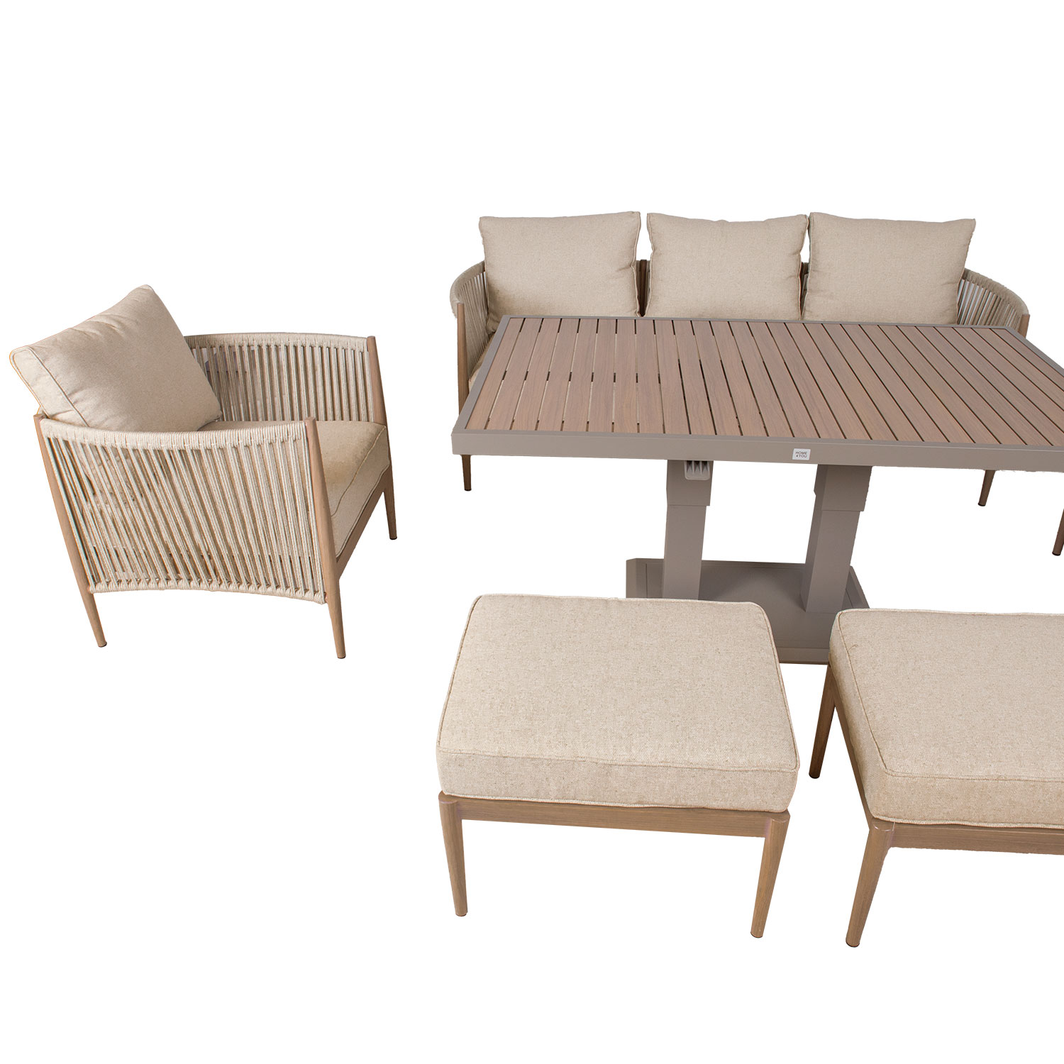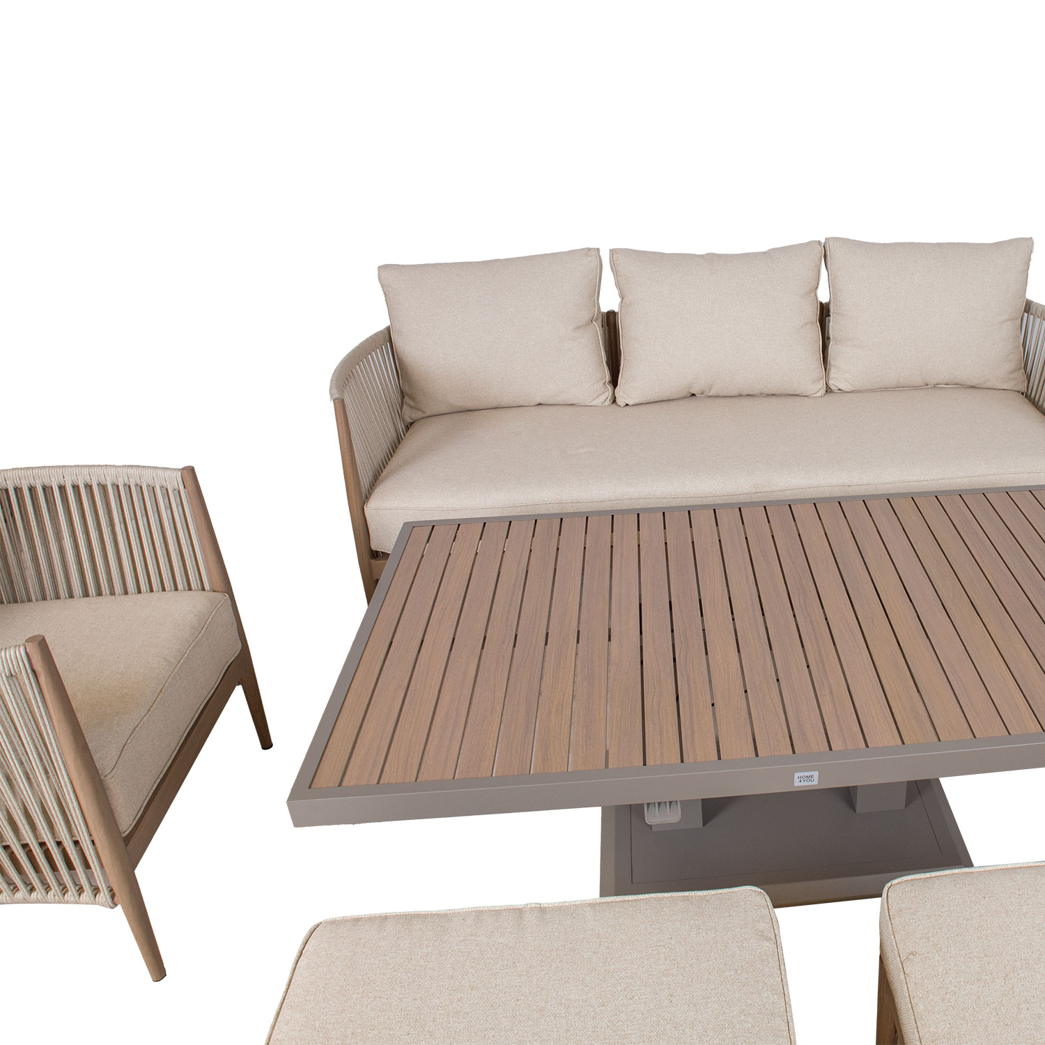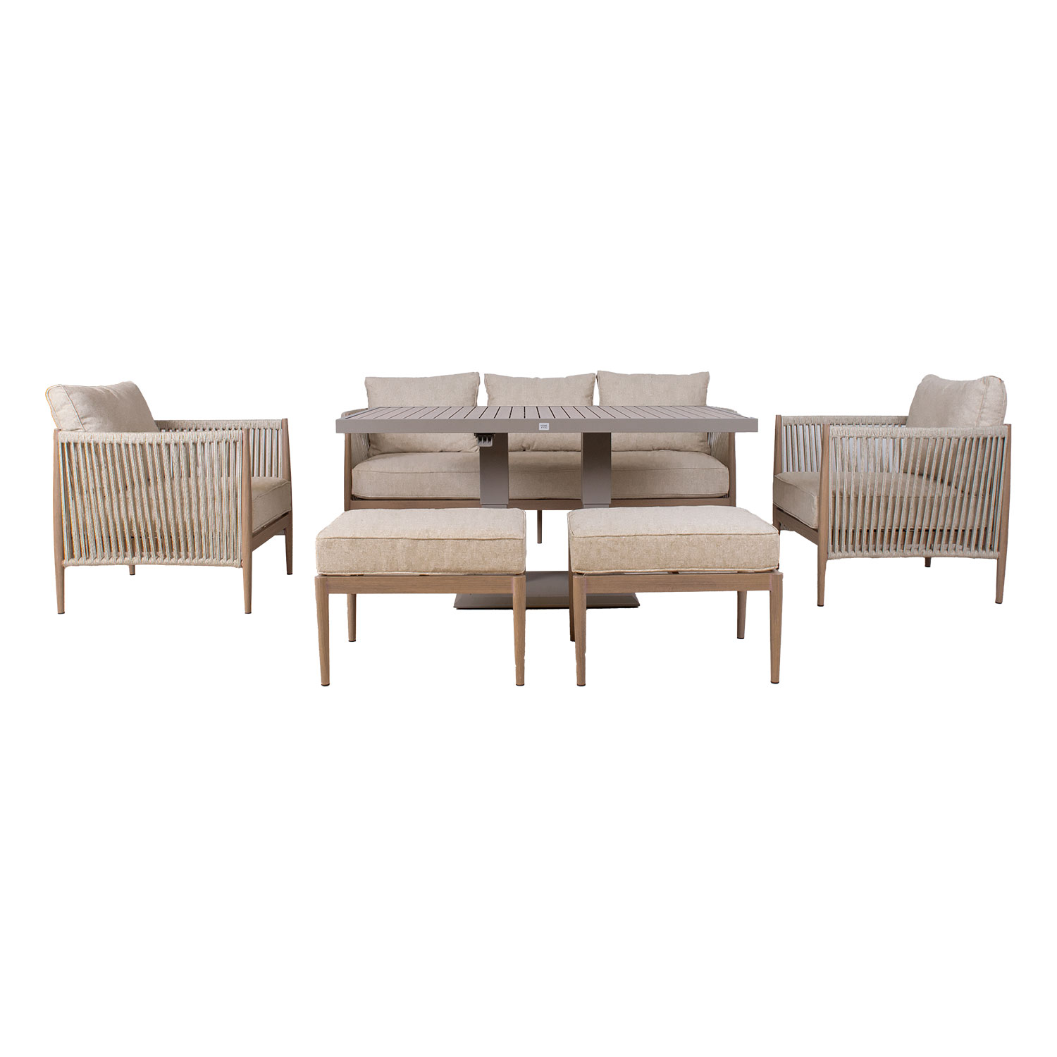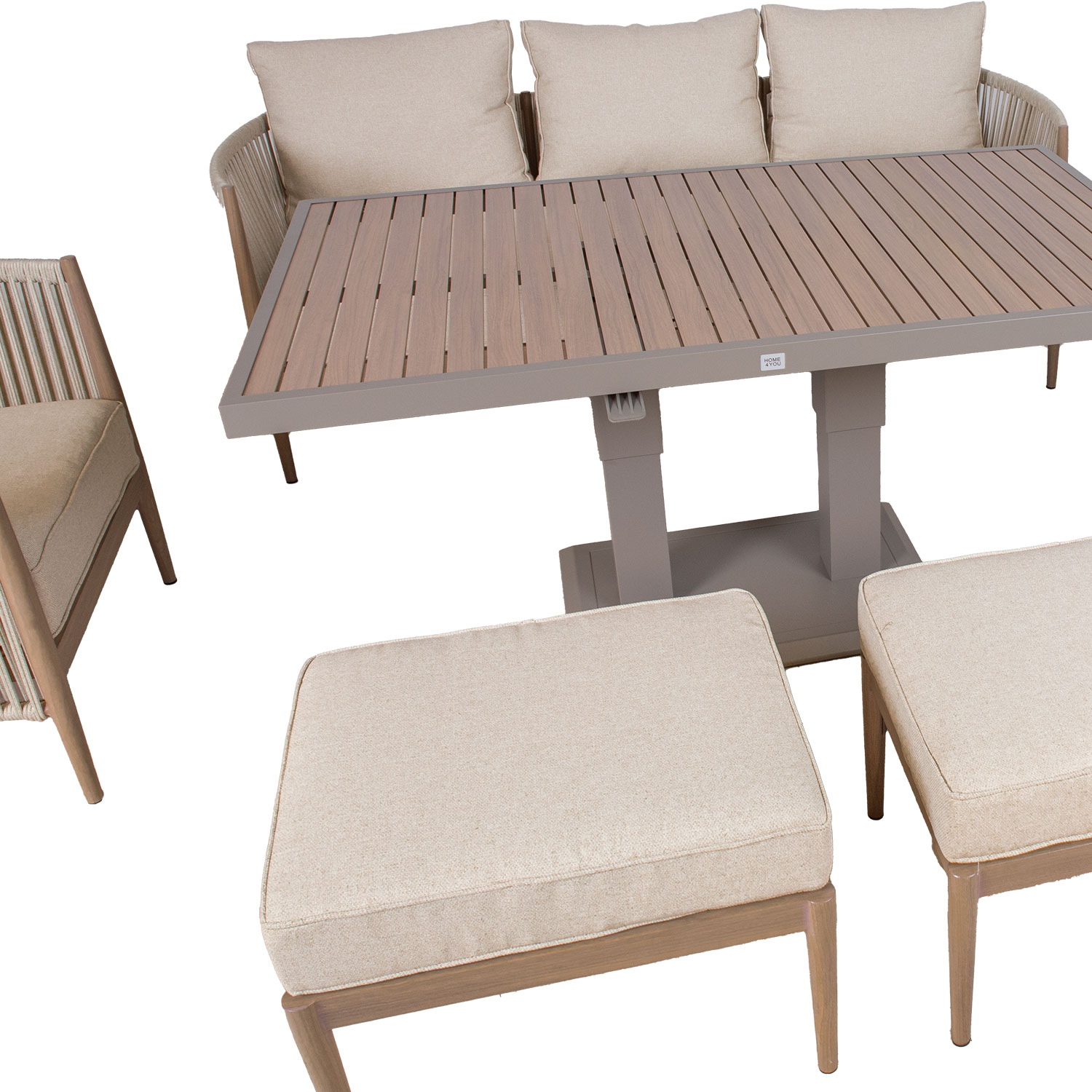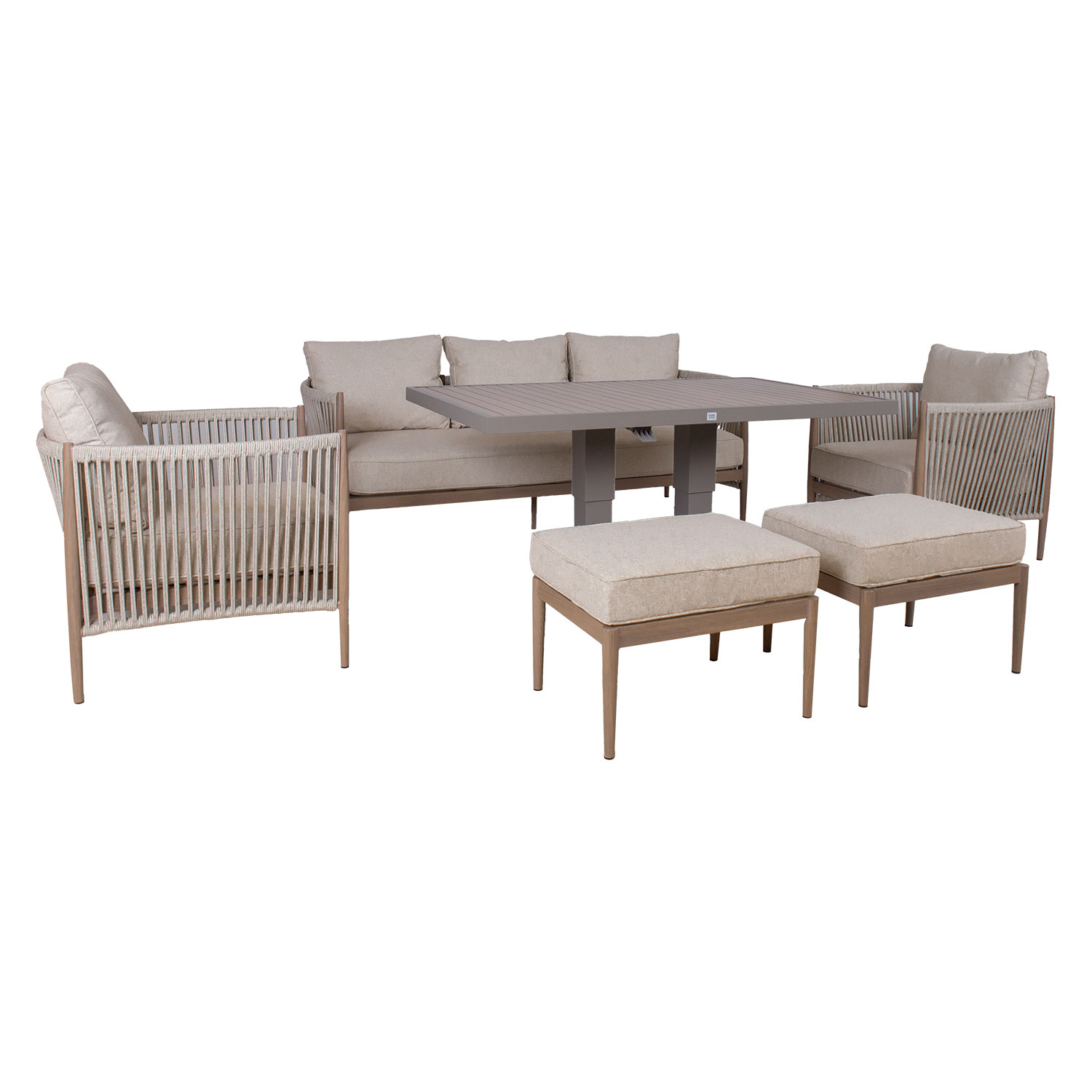 Aiamööblikomplekt MEDINA muudetava kõrgusega laud, 3-kohaline diivan, 2 tugitooli ja 2 tumbat, beež.