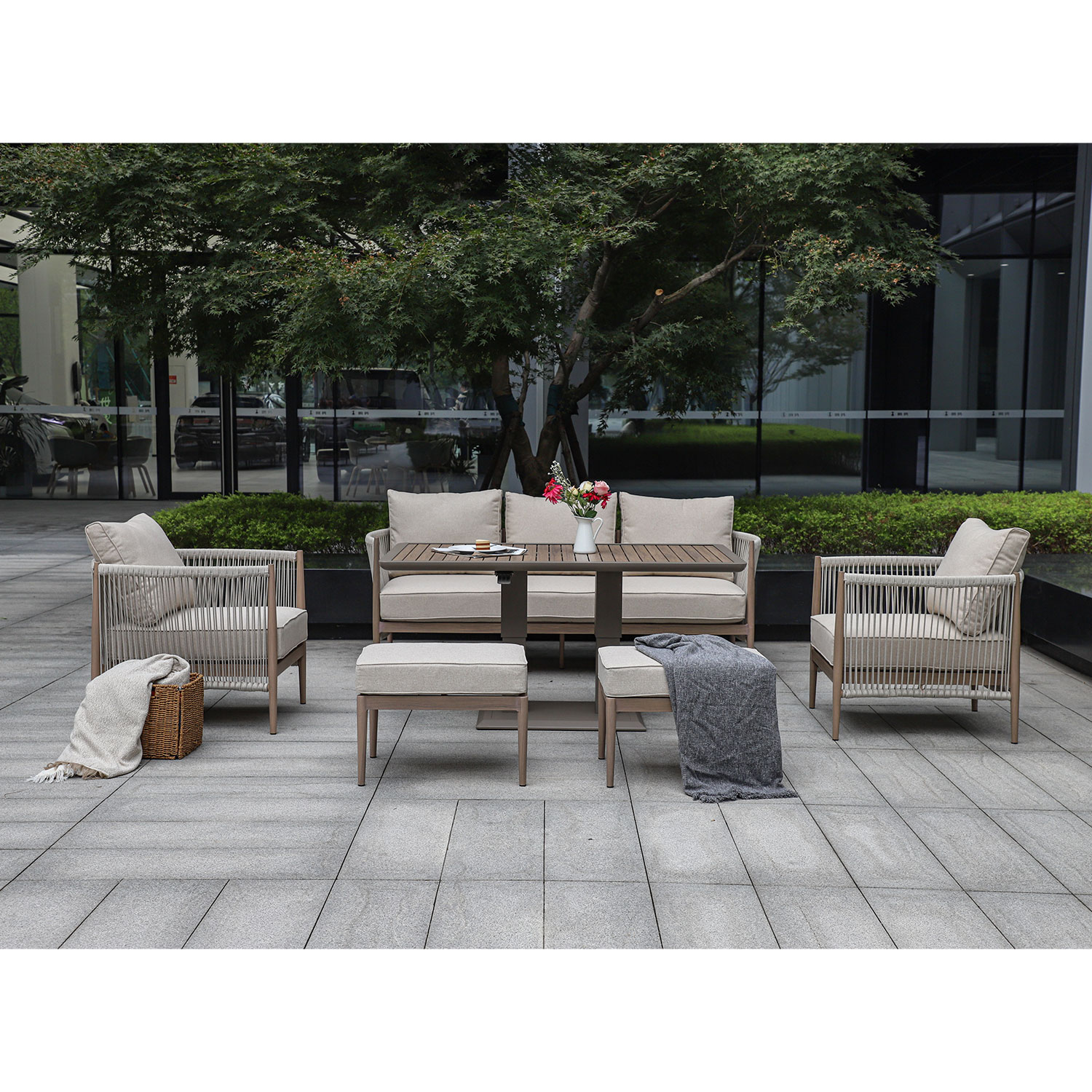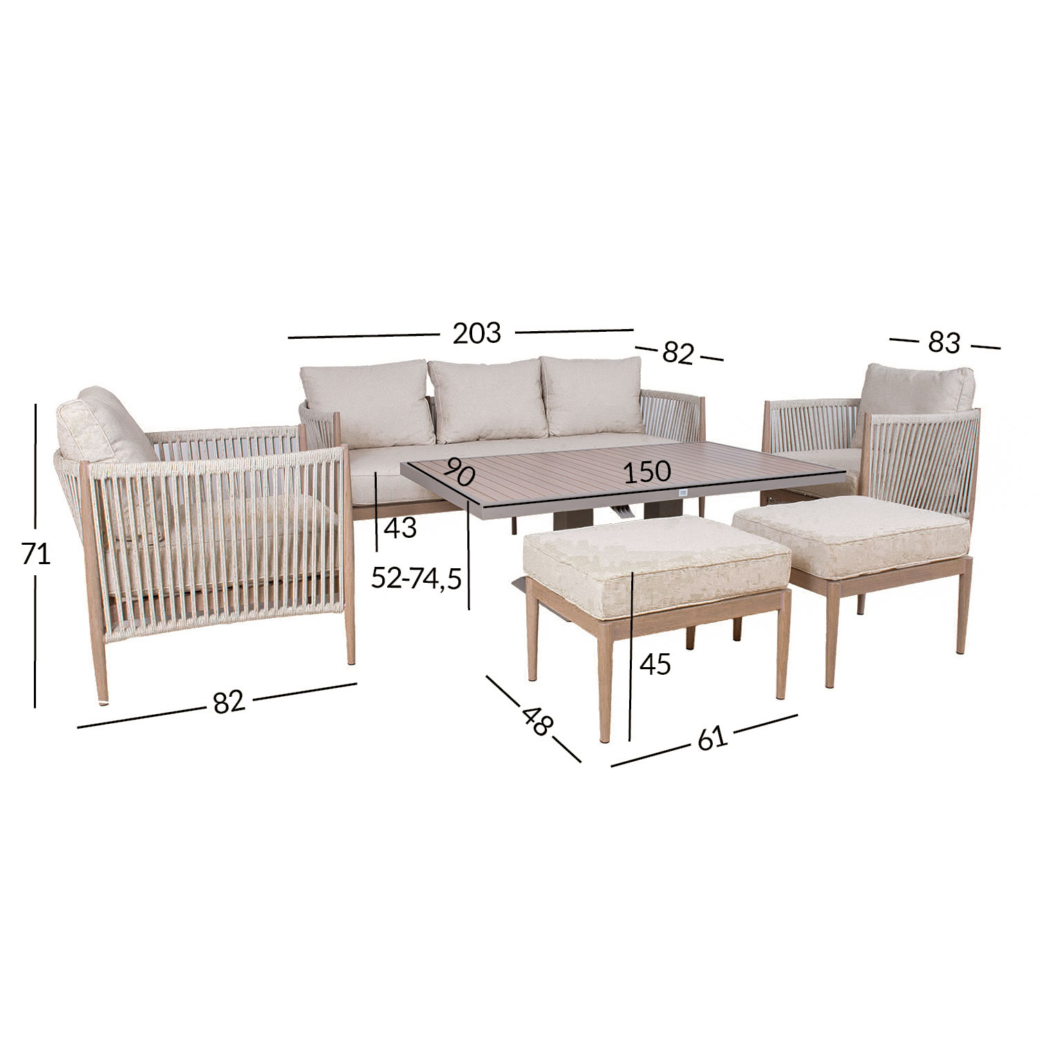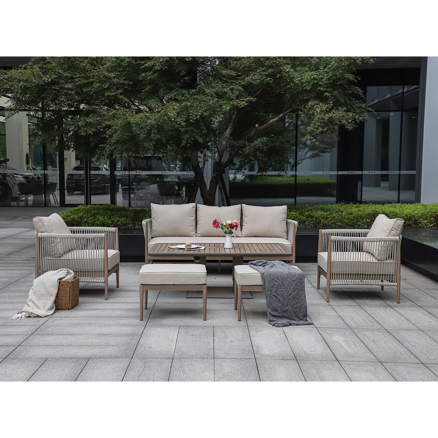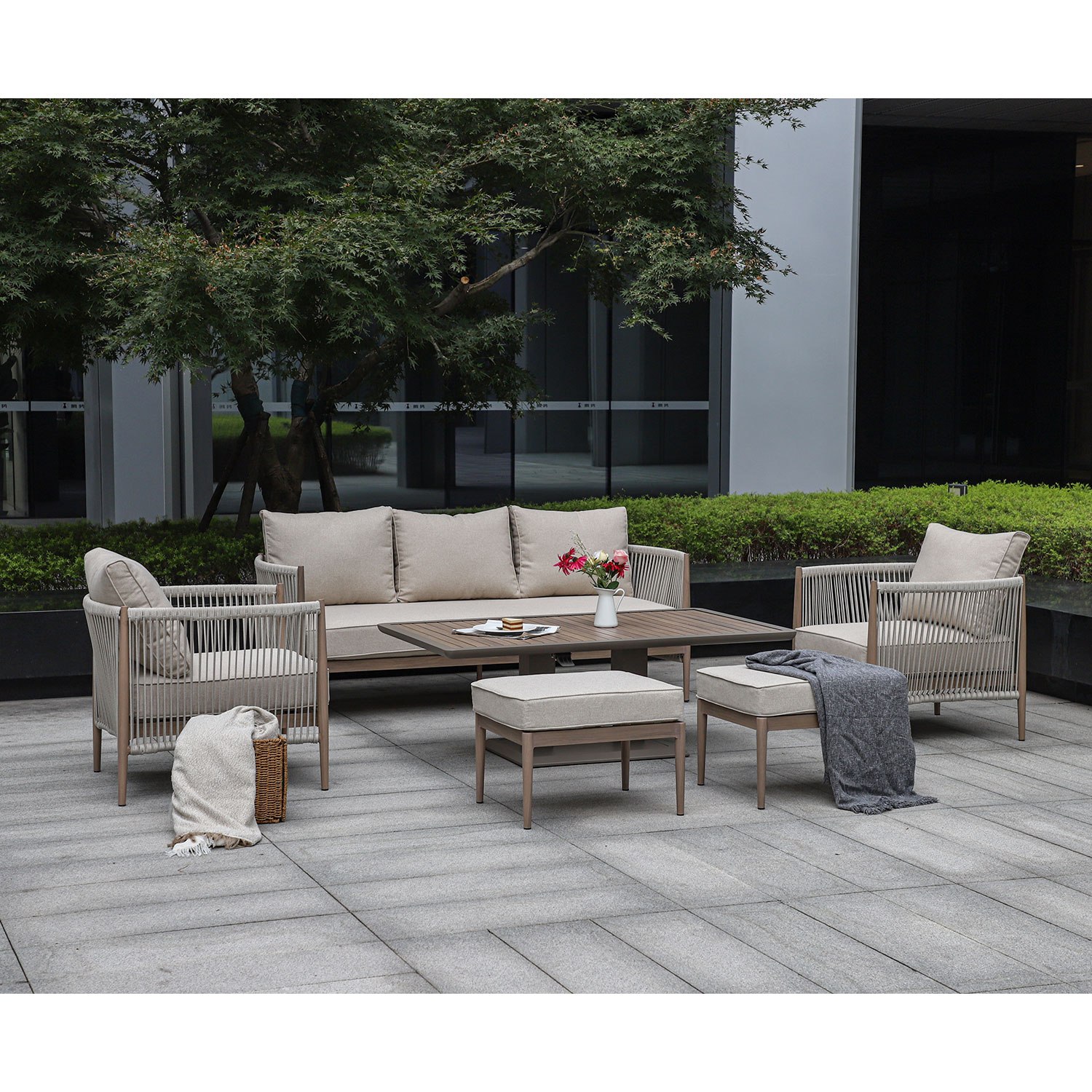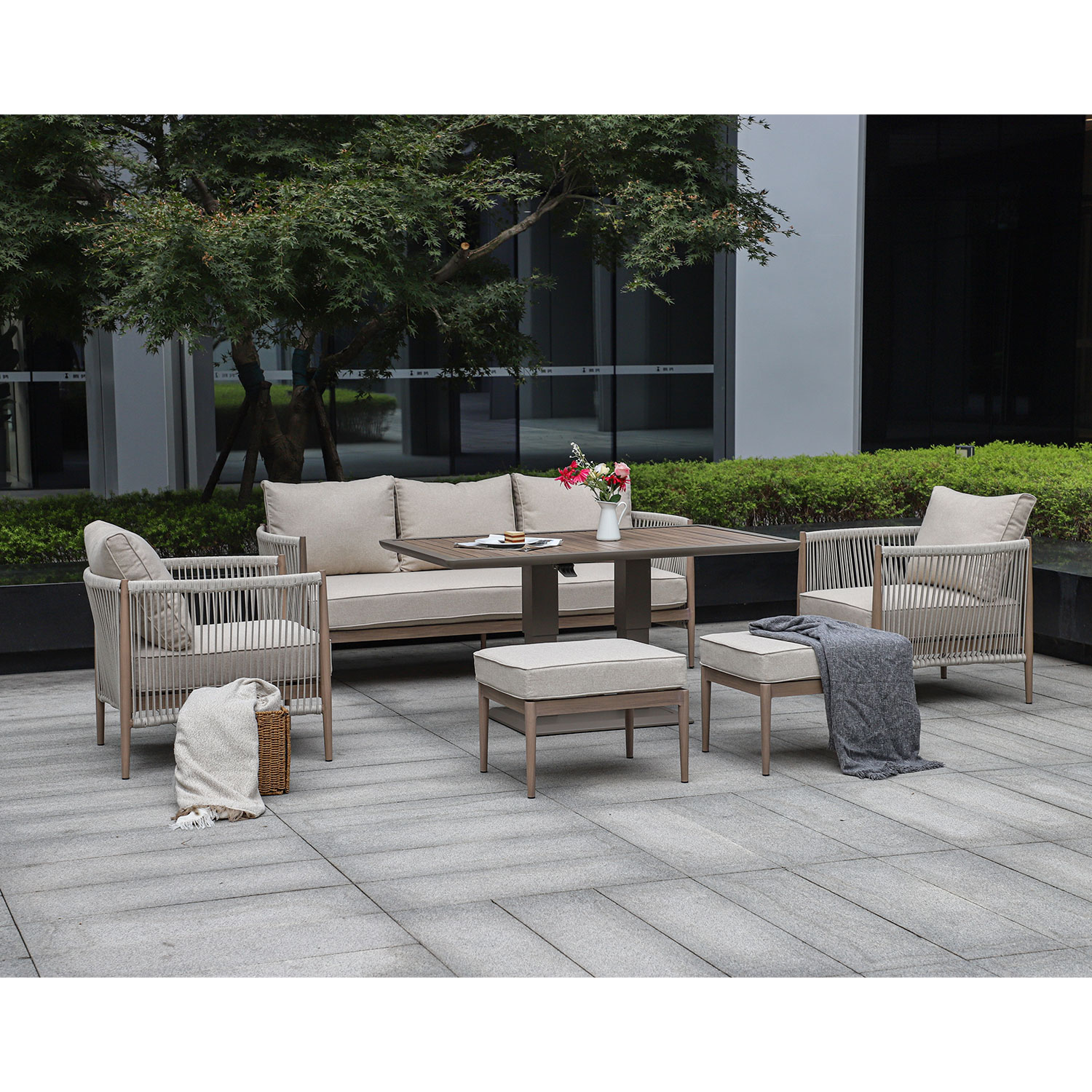 Aiamööblikomplekt MEDINA muudetava kõrgusega laud, 3-kohaline diivan, 2 tugitooli ja 2 tumbat, beež.