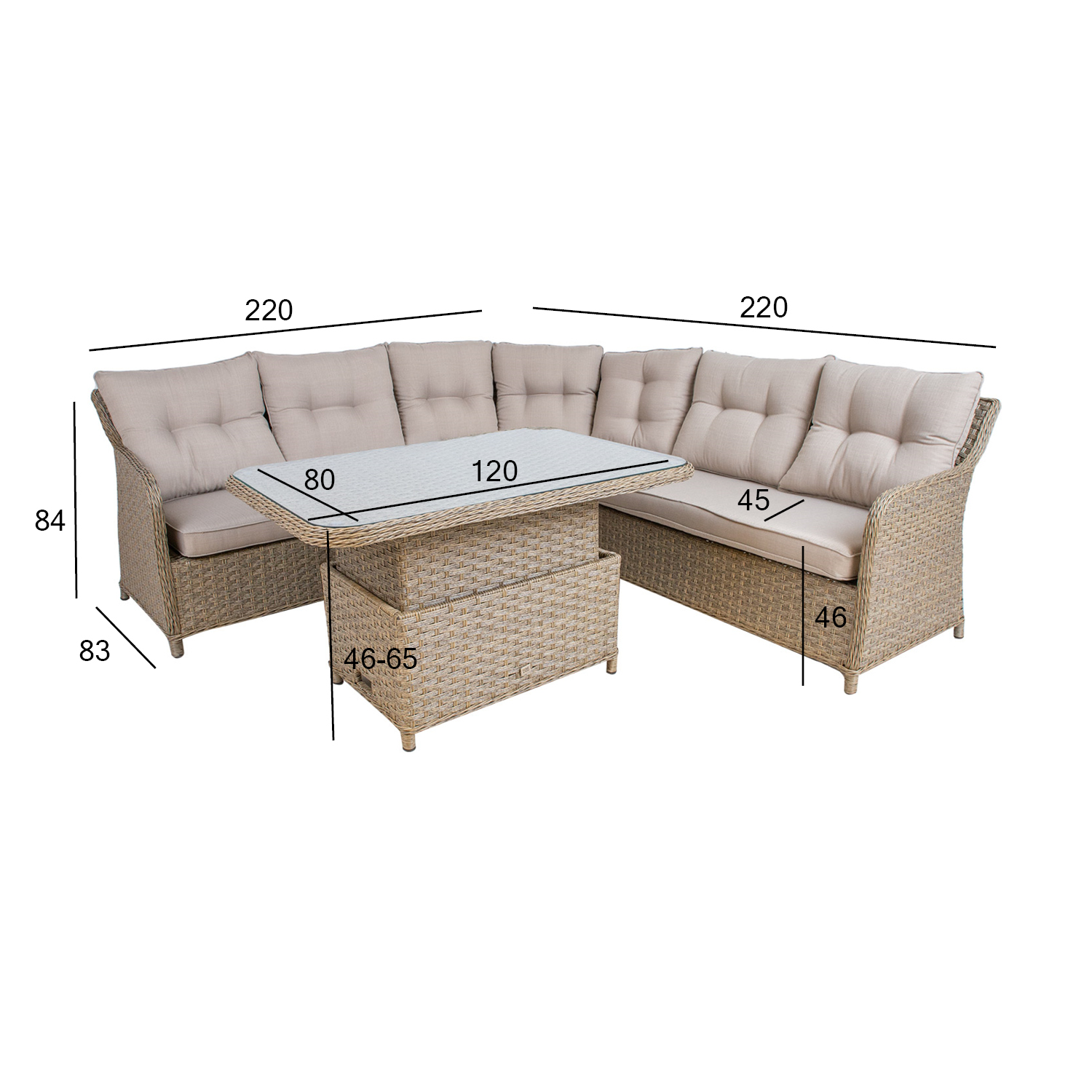 Aiamööblikomplekt PACIFIC on kombineeritav kõigi sama sarja toodetega. Komplekti kuuluvad pehmete patjadega nurgadiivan ja muudetava kõrgusega laud. Kõigi komplekti osade raamid on valmistatud alumiiniumist ja kaetud plastikpunutisega. Nurgadiivan koosneb 3-st moodulist: vasak- ja parempoolse käetoega 2-kohaline moodul 124x83xH84cm, nurgamoodul 158x83xH84cm. Istmekõrgus 46cm (koos padjaga), käetoe kõrgus maast 62cm. Laua mõõdud 120x80xH46/65cm, lauaplaat: 5mm karastatud läbipaistev klaas. Padjakatted on valmistatud polüesterkangast. Komplekti kuulub 2 istmepatja 118x63xH10cm, kaarekujuline istmepadi 40/125x63xH10cm, 4 seljatoepatja 65x56x11cm, 3 seljatoepatja 58x58x11cm. Toode on muutlikes ilmastikutingimustes vastupidav ja väga lihtsalt hooldatav. Padjad on valmistatud õues kasutamiseks sobivatest materjalidest, kuid liigniiskus võib põhjustada hallituse teket ning UV kiirguse mõjul luituvad kattematerjali värvid. Hea lahendus patjade igapäevaseks hoiustamiseks ja kuivana hoidmiseks on padjakast. Välitingimustes kasutatava mööbli eluea pikendamiseks soovitame kasutada välimööbli katteid. HOIUSTAMINE: suvehooaja lõppedes soovitame aiamööblit hoiustada siseruumides. Puhastage ja kuivatage mööbel enne hoiule panekut. Kasutage hoiustamiseks kuiva ning hea ventilatsiooniga ruumi.