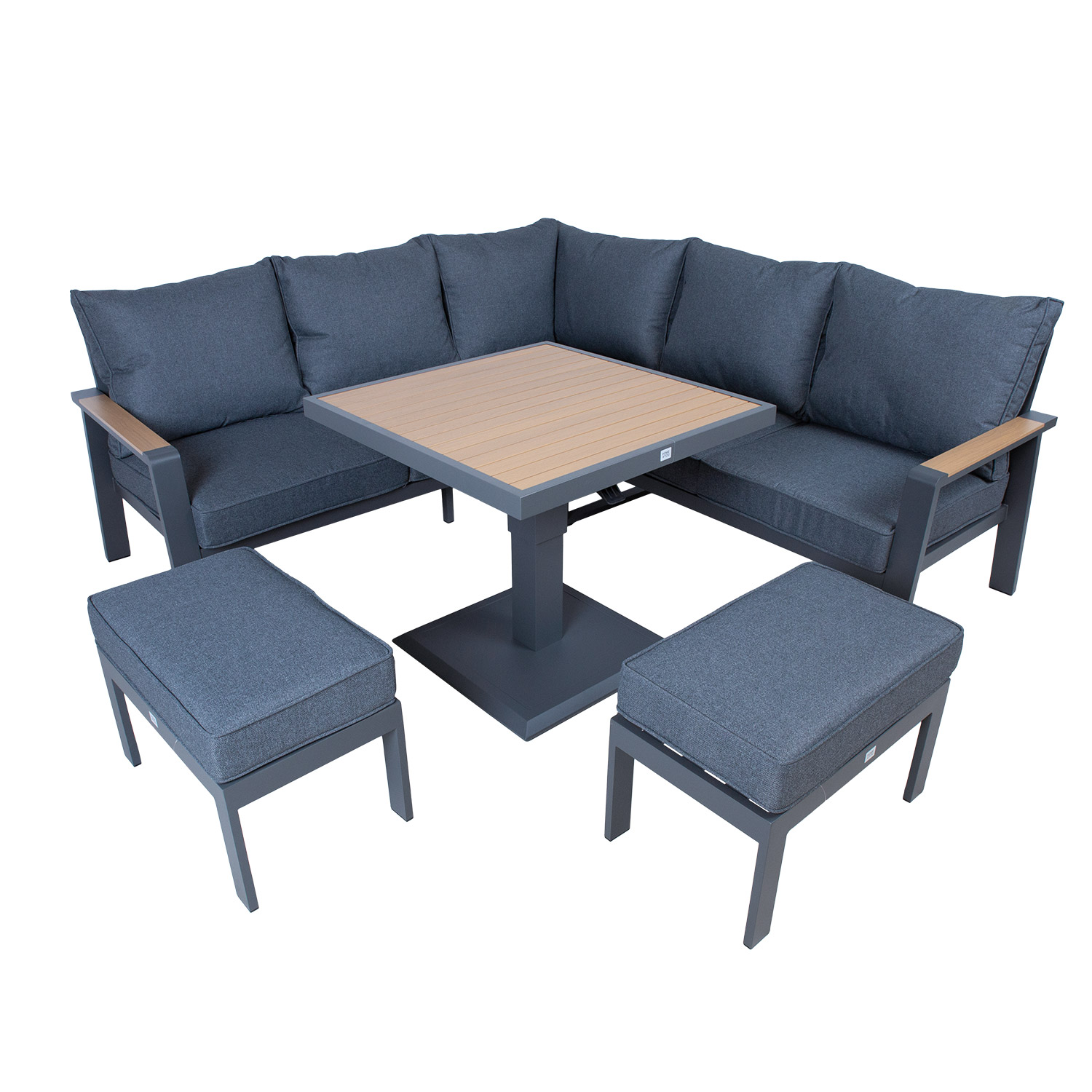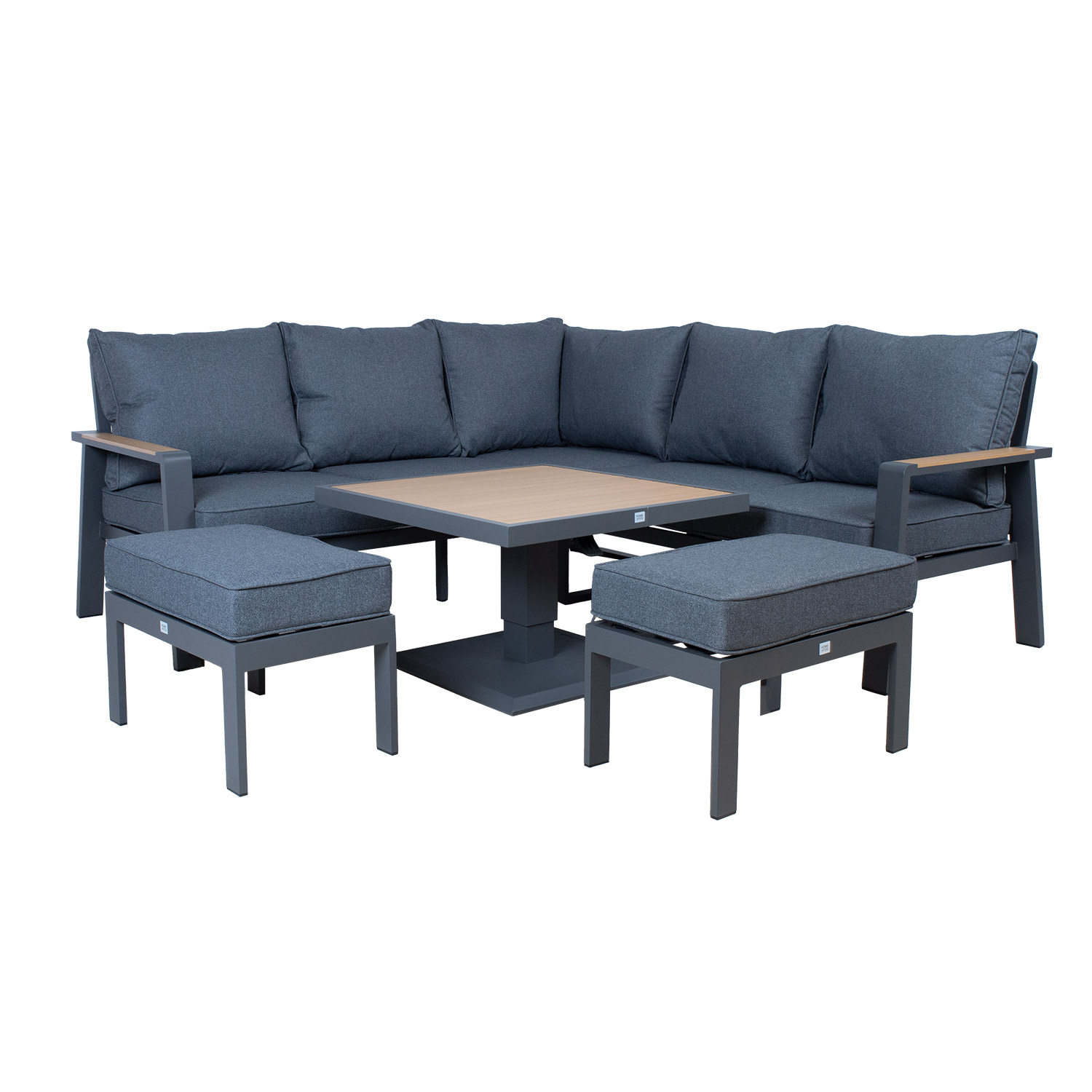 Komplekti kuulub muudetava kõrgusega laud, nurgadiivan ja 2 tumbat.