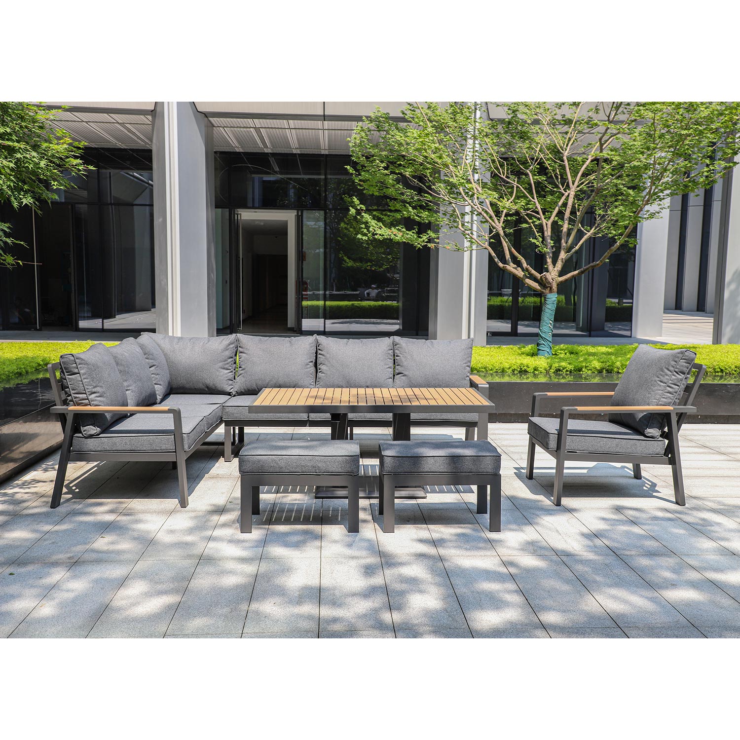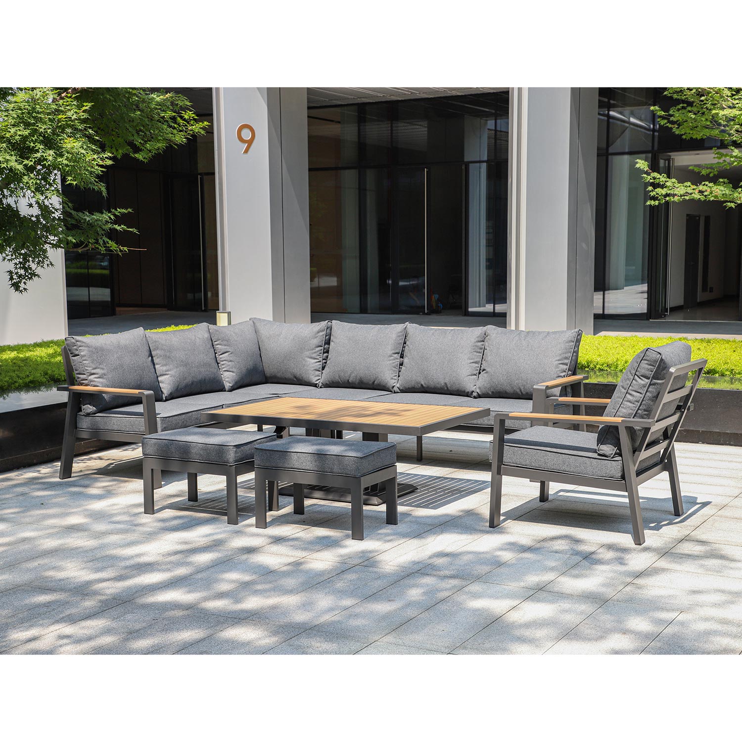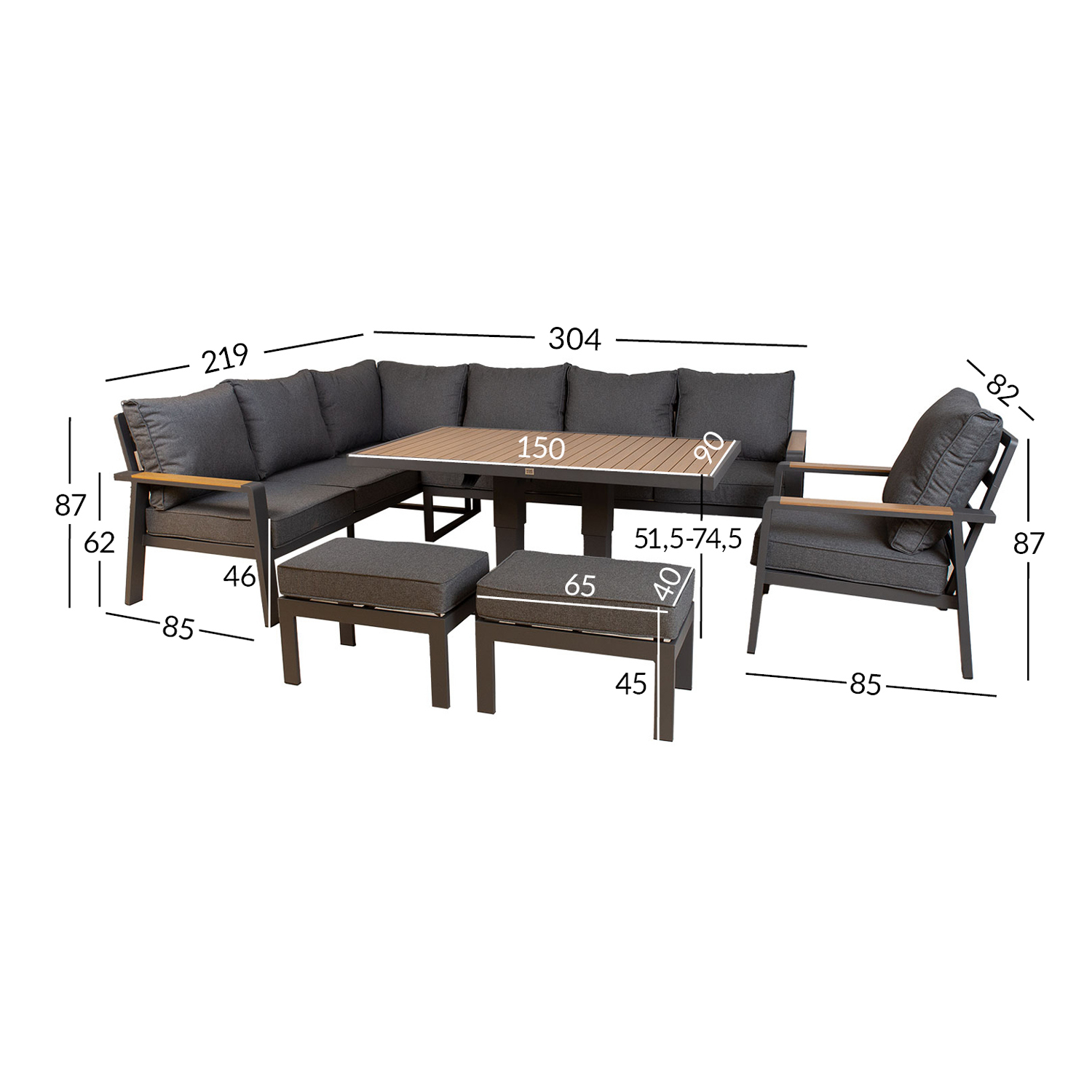 Komplekti kuulub muudetava kõrgusega laud, nurgadiivan, tugitool ja 2 tumbat.