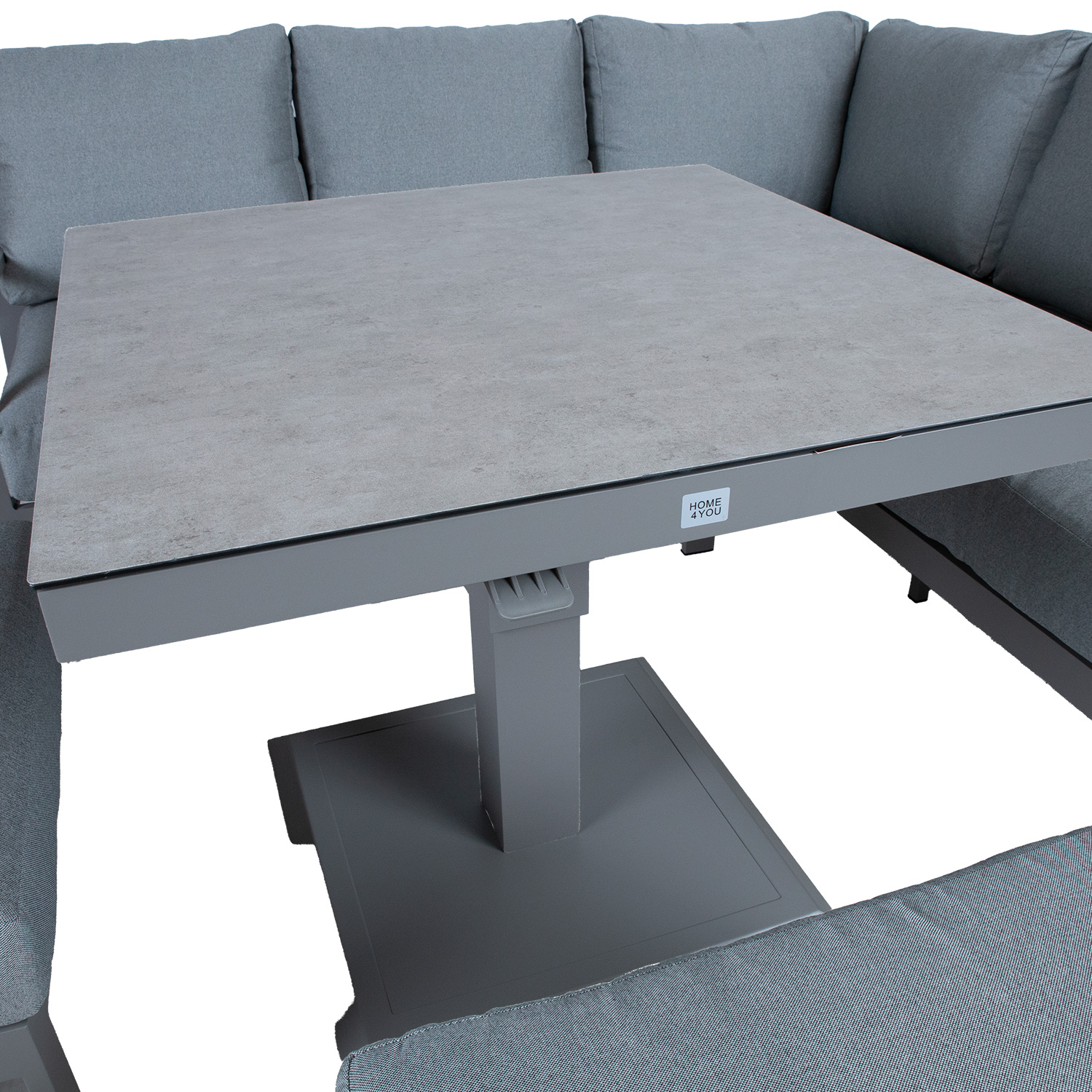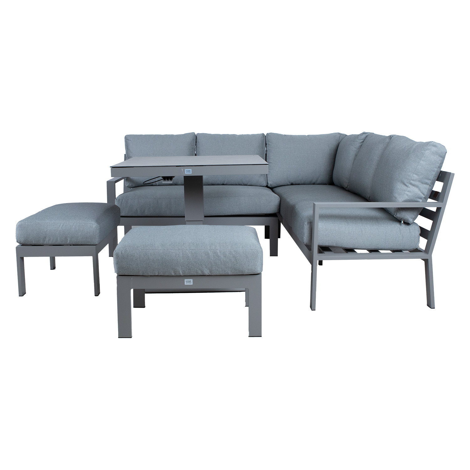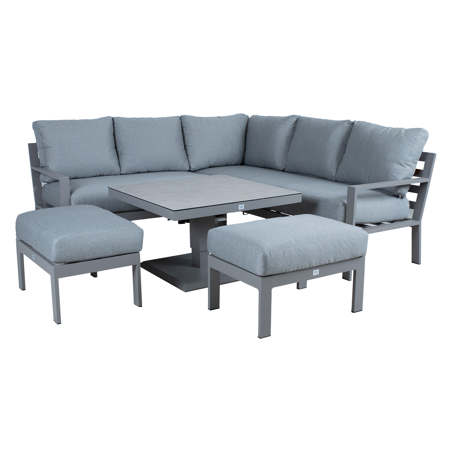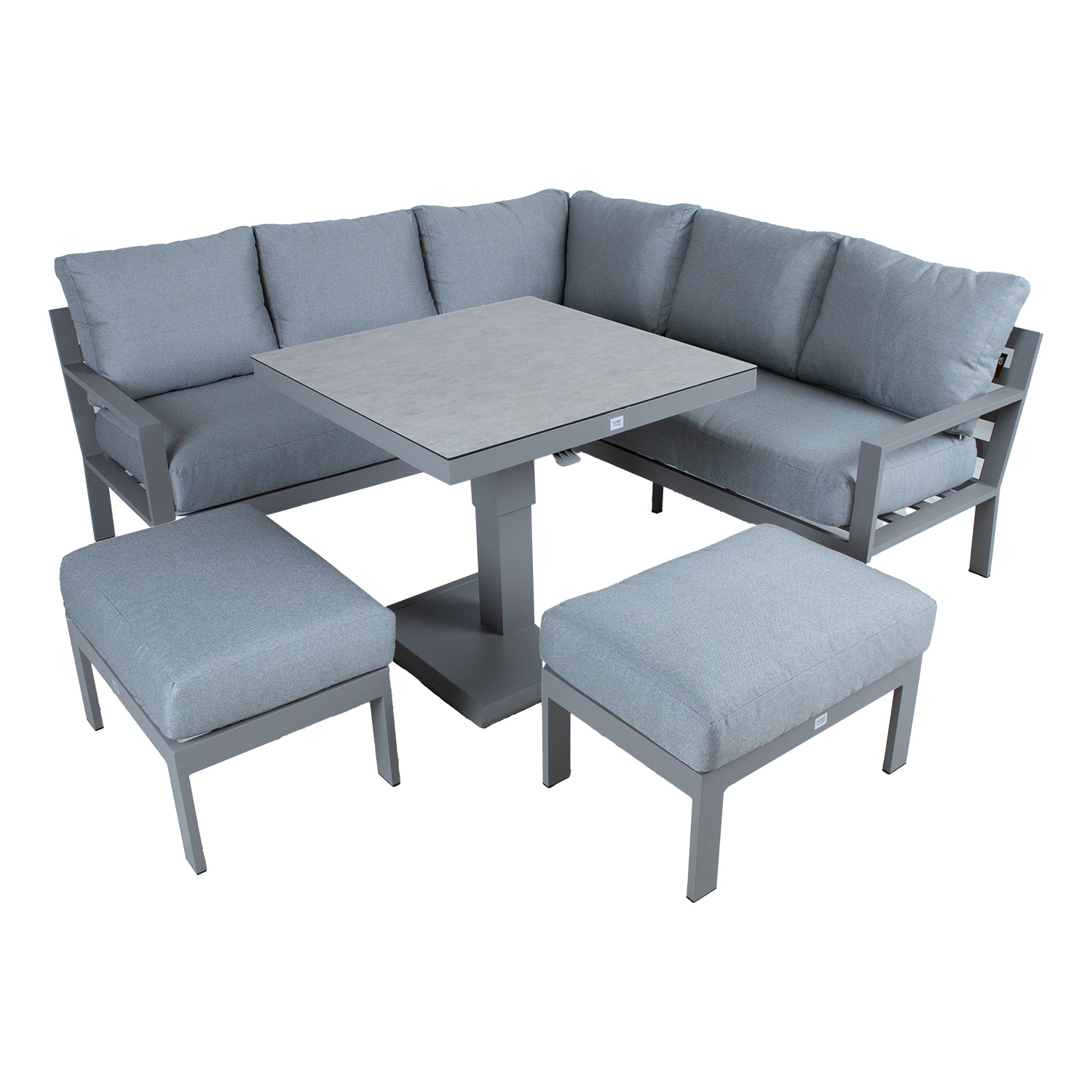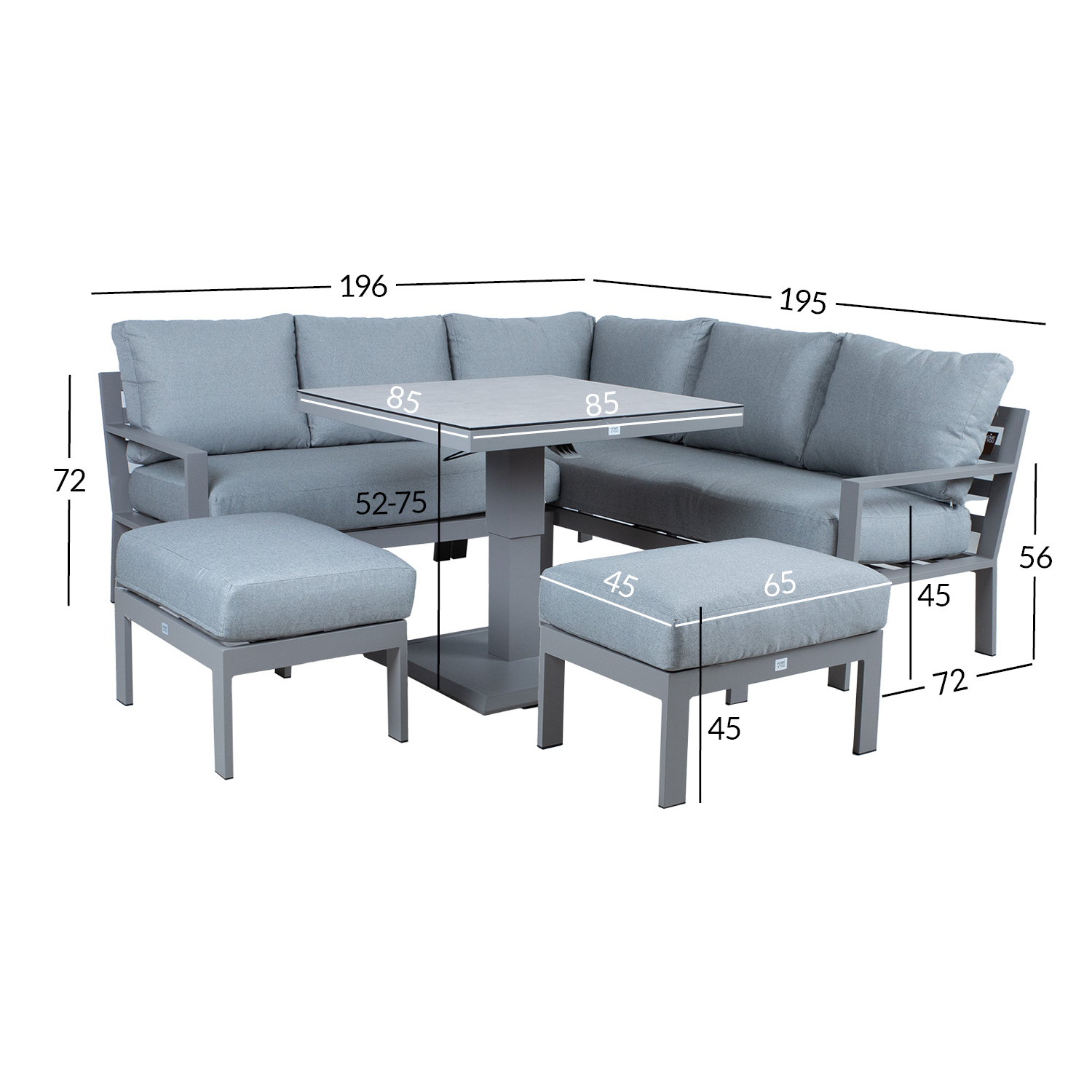 Komplekti kuulub muudetava kõrgusega laud, nurgadiivan ja 2 tumbat. Komplekti kõigi osade raamid on valmistatud alumiiniumist ja viimistletud hallikasbeeži pulbervärviga.