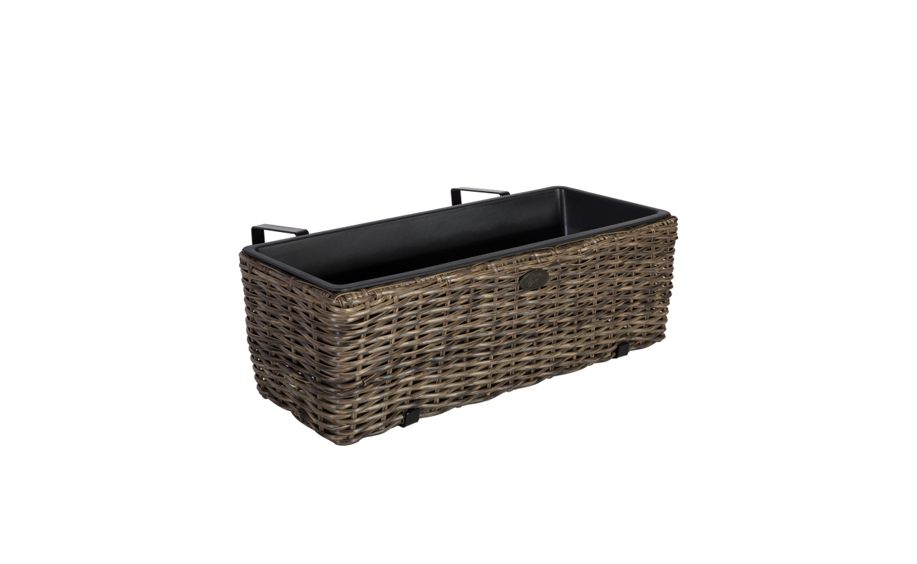 Rõdu lillekast WICKER 60x19xH18cm, hall. Lillekasti metallraam on kaetud plastikpunutisega. Plastikust sisepoti mõõdud on 56×15,5xH13cm. Sisepott on ilma auguta. Kastil on kaks metallist kinnitusklambrit. Klambri vahekaugus kasti äärest 10cm.
