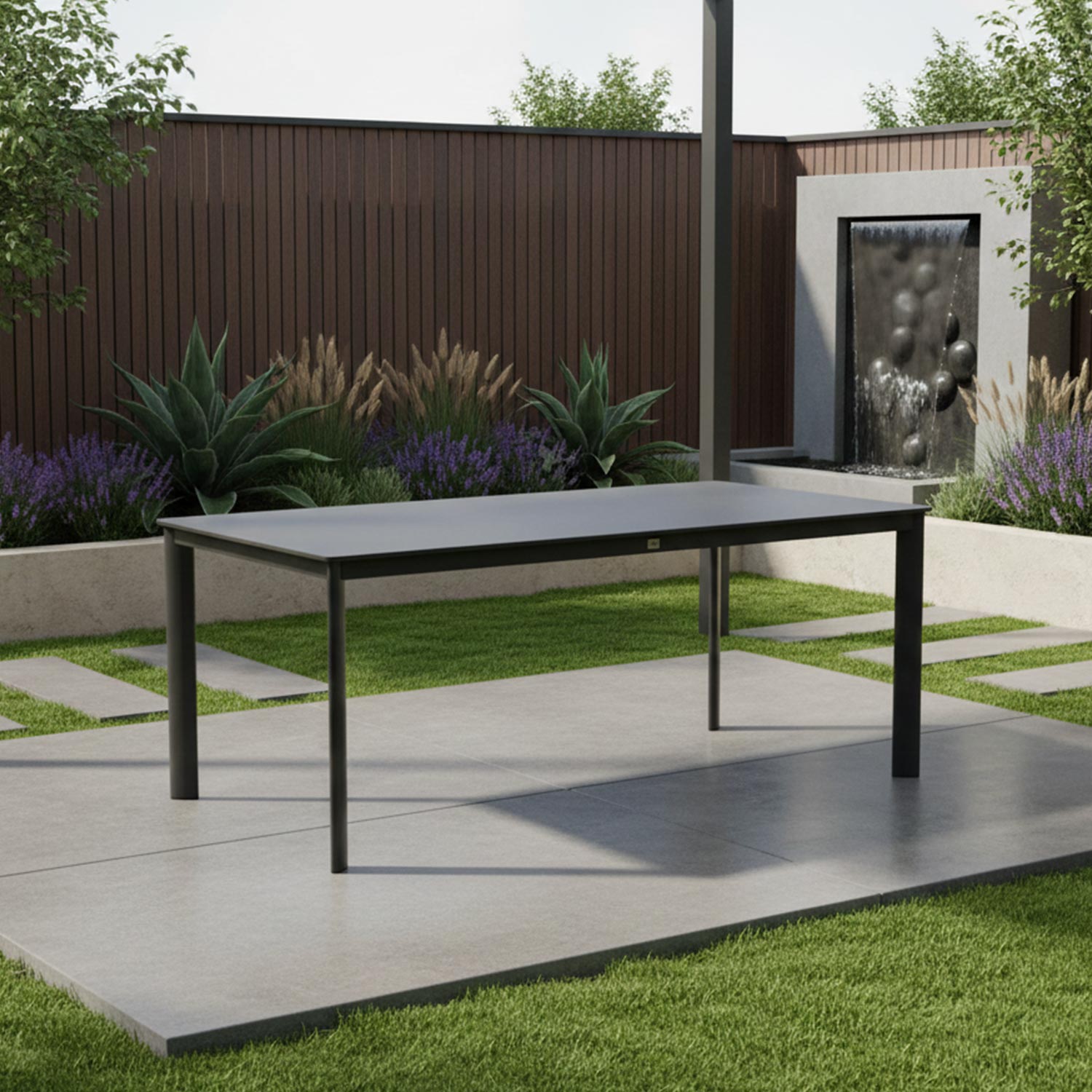 Laua mõõdud 180 x 90 x H75 cm, lauaplaadi paksud 11 mm. Jalad ja raam on valmistatud alumiiniumist (48 x 25 x 1,2 mm) ja viimistletud halli pulbervärviga.