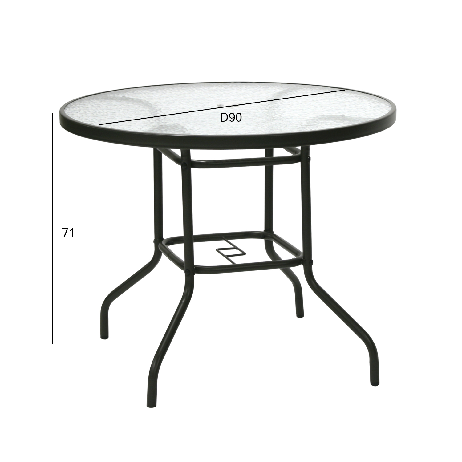 Lauaplaat: 5 mm läbipaistev laineline klaas. Laua keskel on päikesevarjuauk D4 cm.