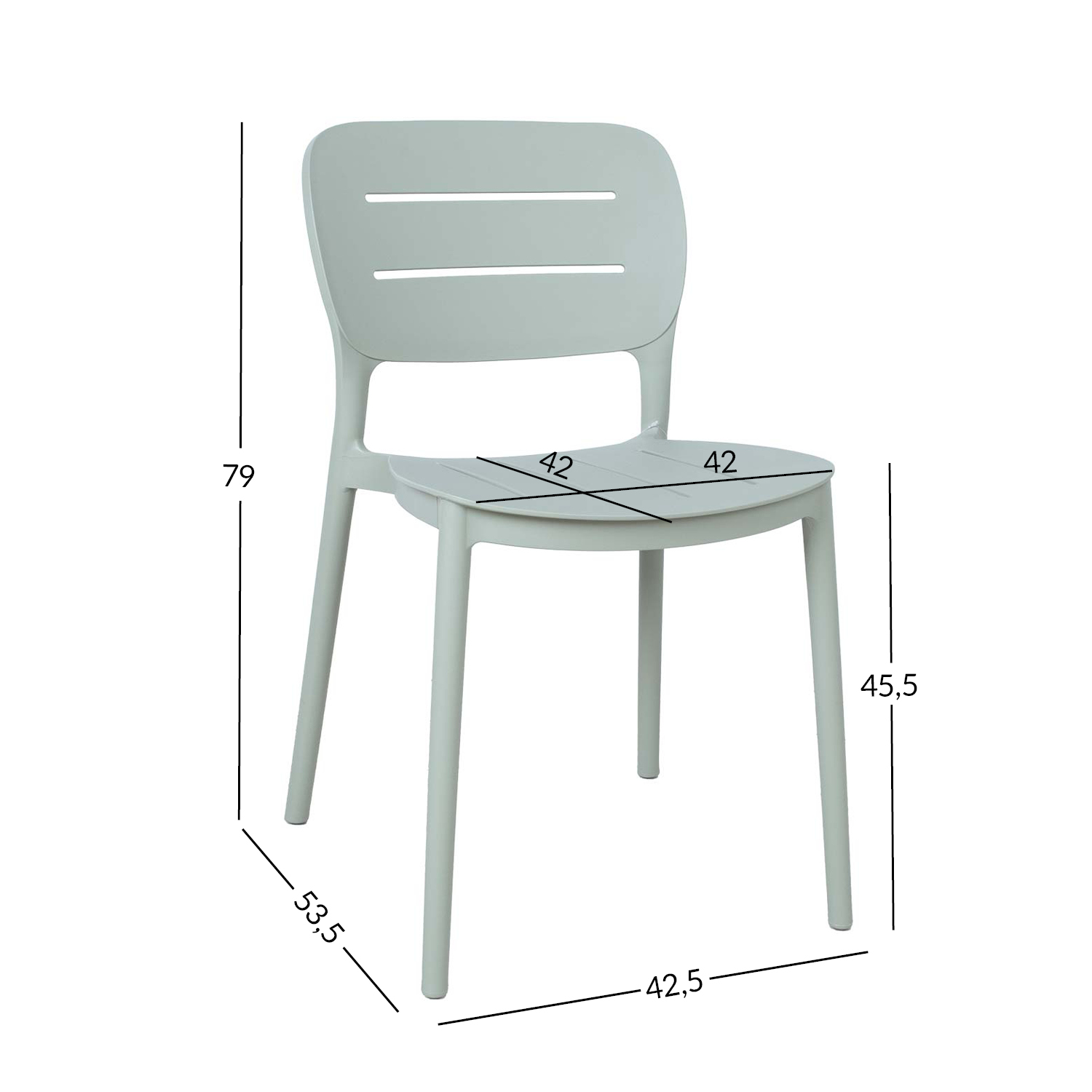 Tooli üldmõõdud on 42,5×53,5xH79cm. Istme laius 42cm, istme sügavus 42cm, istme kõrgus 45,5cm.