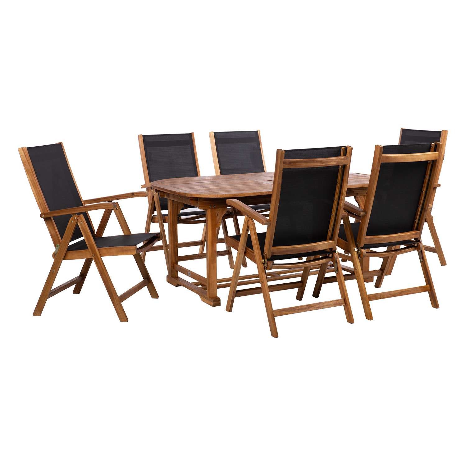 Aiamööblikomplekt FABIOLA laud ja 6 reguleeritava seljatoega kokkupandavat tooli.