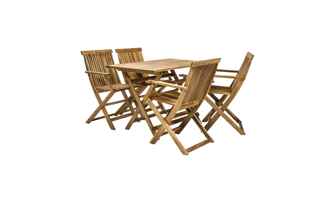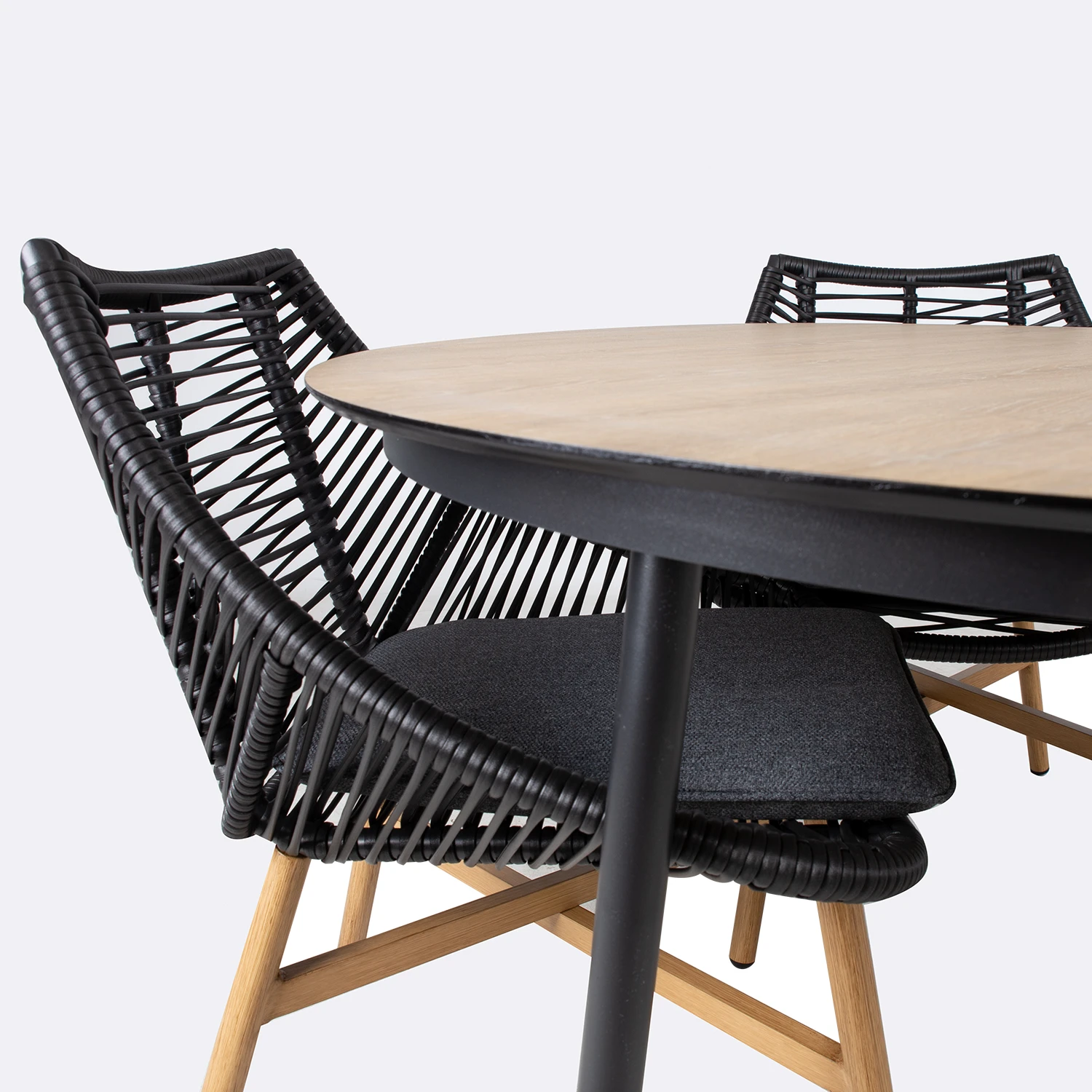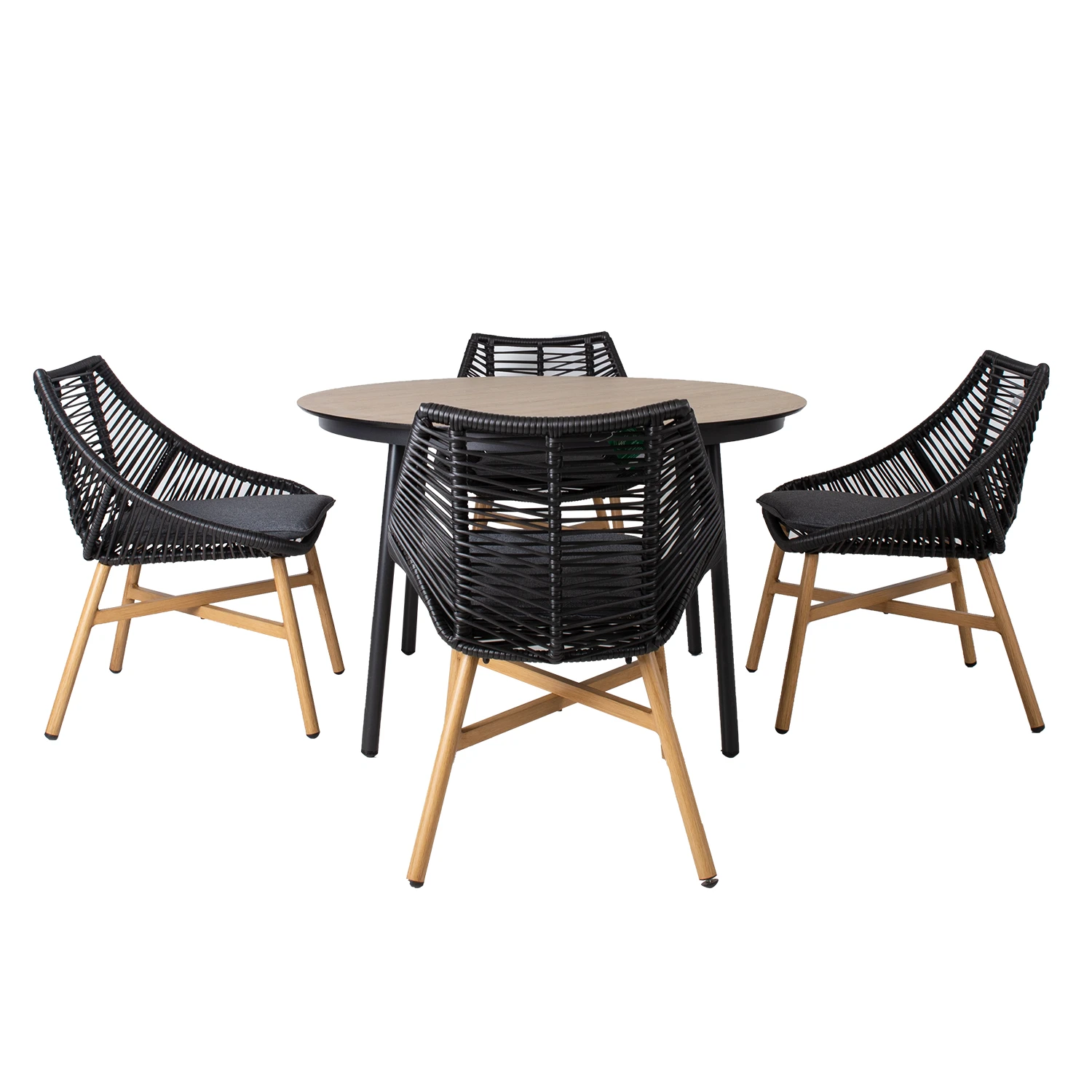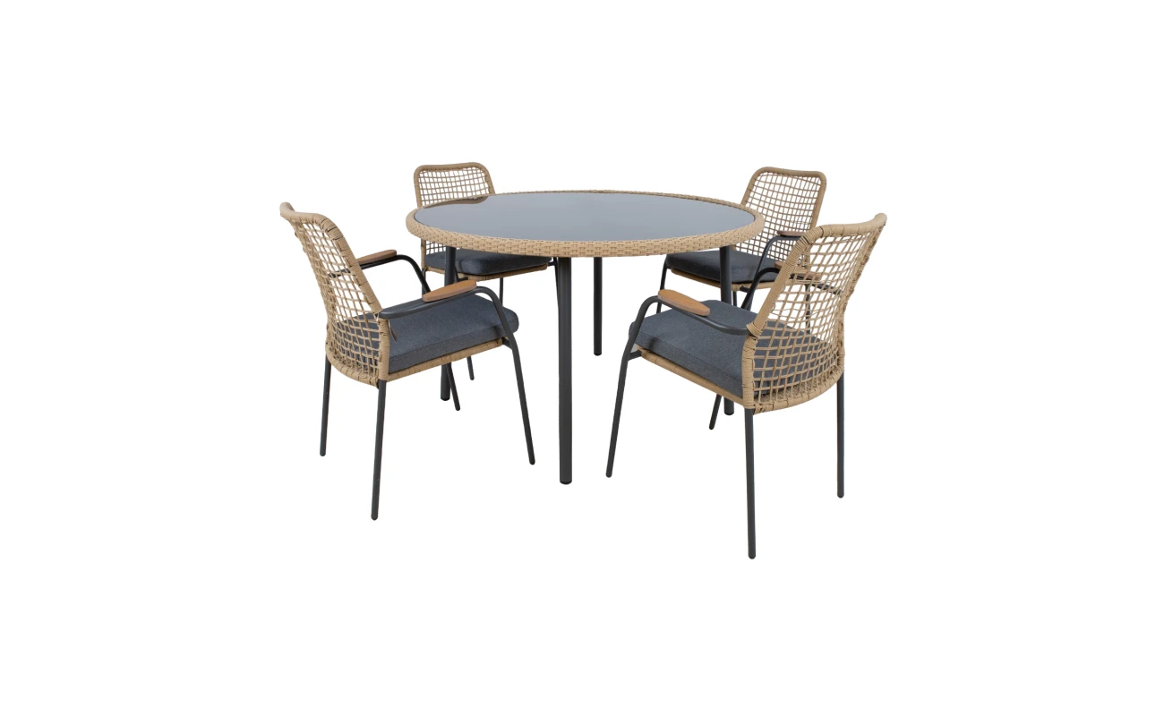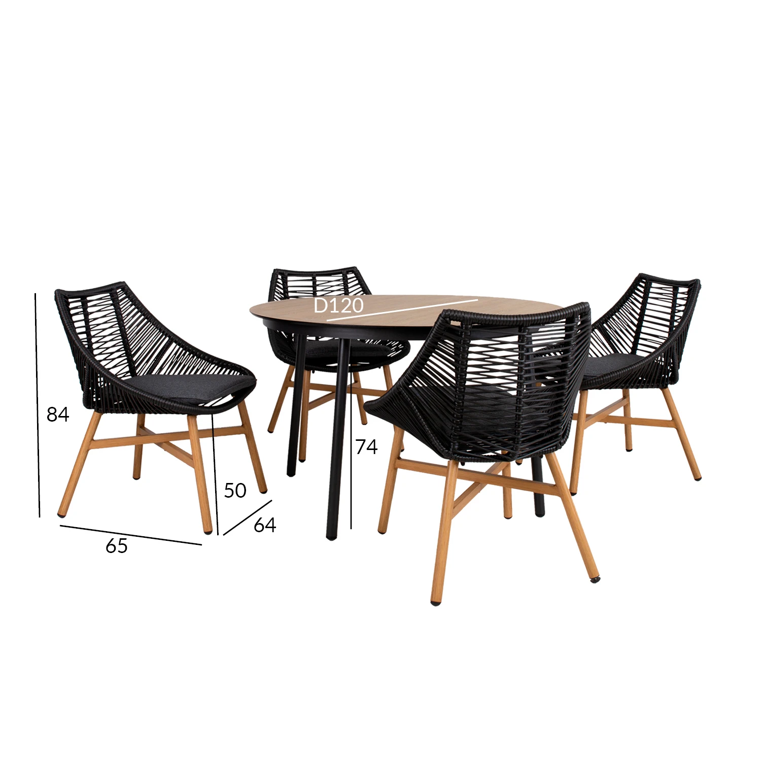 Aiamööbli komplekt HELSINKI laud ja 4 tooli. Laua mõõdud on D120xH74cm. Lauaplaat: tiikpuu dekooriga ilmastikukindel kõrgsurvelaminaat. Laua raam ja jalad on valmistatud alumiiniumist ning viimistletud musta pulbervärviga. Tooli mõõdud on 64x65xH84cm. Tooli jalad ja raam on valmistatud alumiiniumist. Tooli iste ja seljatugi on kaetud musta plastikpunutisega. Istmepadi kuulub komplekti. Padjakate on valmistatud tumehallist polüesterkangagast. Tooli jalad ja alusraam on käsitsi värvitud tiikpuud meenutava bee˛i värviga. Kaalupiirang 120kg. Toode on muutlikes ilmastikutingimustes hästi vastupidav ja lihtsalt hooldatav. Kaitset ilmastikuolude eest vajavad ainult padjad. Välitingimustes kasutatava mööbli eluea pikendamiseks soovitame kasutada välimööbli katteid. HOIUSTAMINE: suvehooaja lõppedes soovitame aiamööblit hoiustada siseruumides. Puhastage ja kuivatage mööbel enne hoiule panekut. Kasutage hoiustamiseks kuiva ning hea ventilatsiooniga ruumi.
