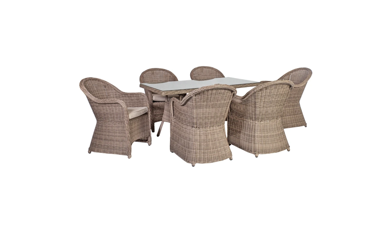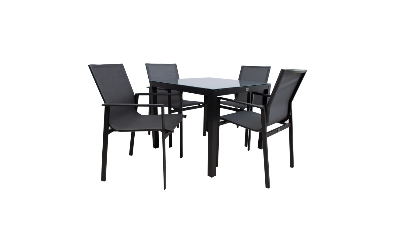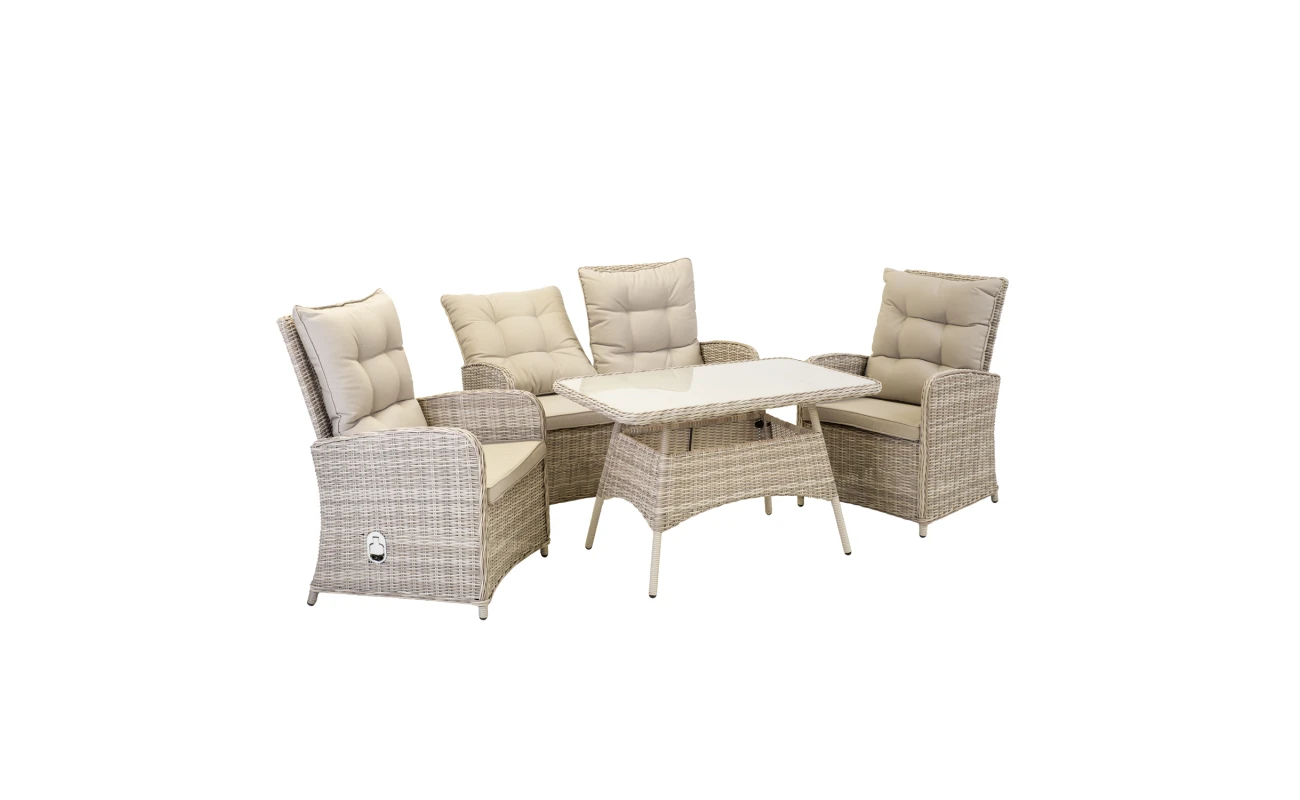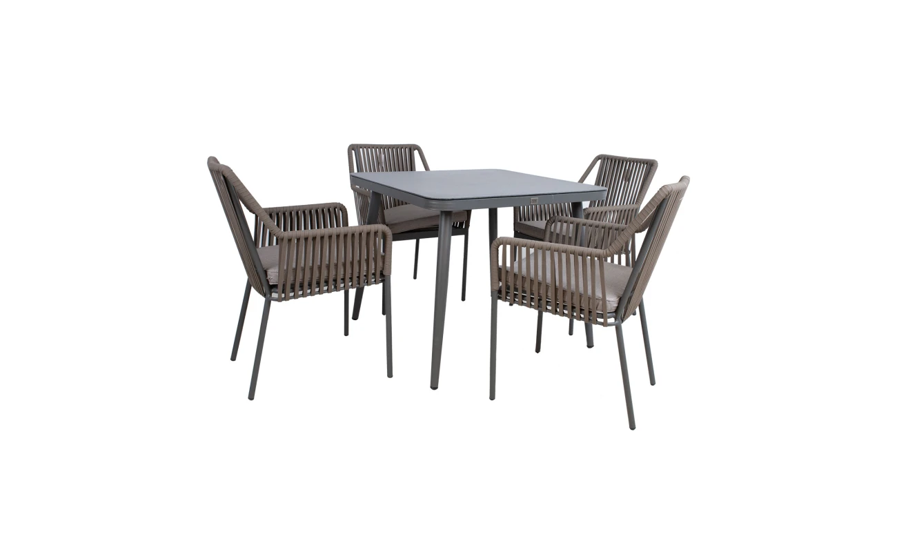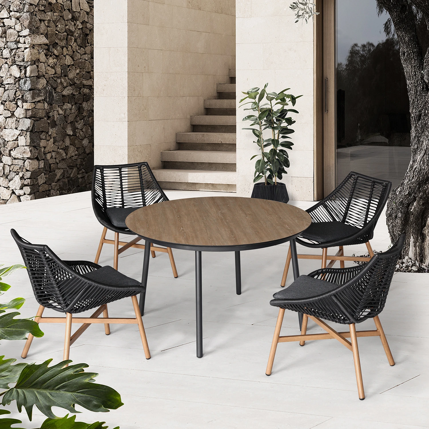 Aiamööbli komplekt HELSINKI laud ja 4 tooli. Laua mõõdud on D120xH74cm. Lauaplaat: tiikpuu dekooriga ilmastikukindel kõrgsurvelaminaat. Laua raam ja jalad on valmistatud alumiiniumist ning viimistletud musta pulbervärviga. Tooli mõõdud on 64x65xH84cm. Tooli jalad ja raam on valmistatud alumiiniumist. Tooli iste ja seljatugi on kaetud musta plastikpunutisega. Istmepadi kuulub komplekti. Padjakate on valmistatud tumehallist polüesterkangagast. Tooli jalad ja alusraam on käsitsi värvitud tiikpuud meenutava bee˛i värviga. Kaalupiirang 120kg. Toode on muutlikes ilmastikutingimustes hästi vastupidav ja lihtsalt hooldatav. Kaitset ilmastikuolude eest vajavad ainult padjad. Välitingimustes kasutatava mööbli eluea pikendamiseks soovitame kasutada välimööbli katteid. HOIUSTAMINE: suvehooaja lõppedes soovitame aiamööblit hoiustada siseruumides. Puhastage ja kuivatage mööbel enne hoiule panekut. Kasutage hoiustamiseks kuiva ning hea ventilatsiooniga ruumi.