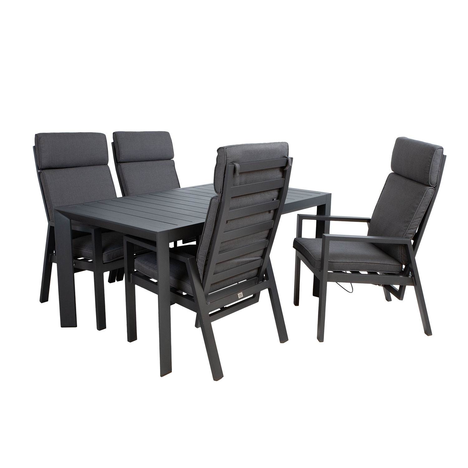 Laua mõõdud: 160 x 90 x H73 cm. Lauaplaat ja jalad ning toolide jalad ja raam on valmistatud alumiiniumist ja viimistletud tumehalli pulbervärviga.