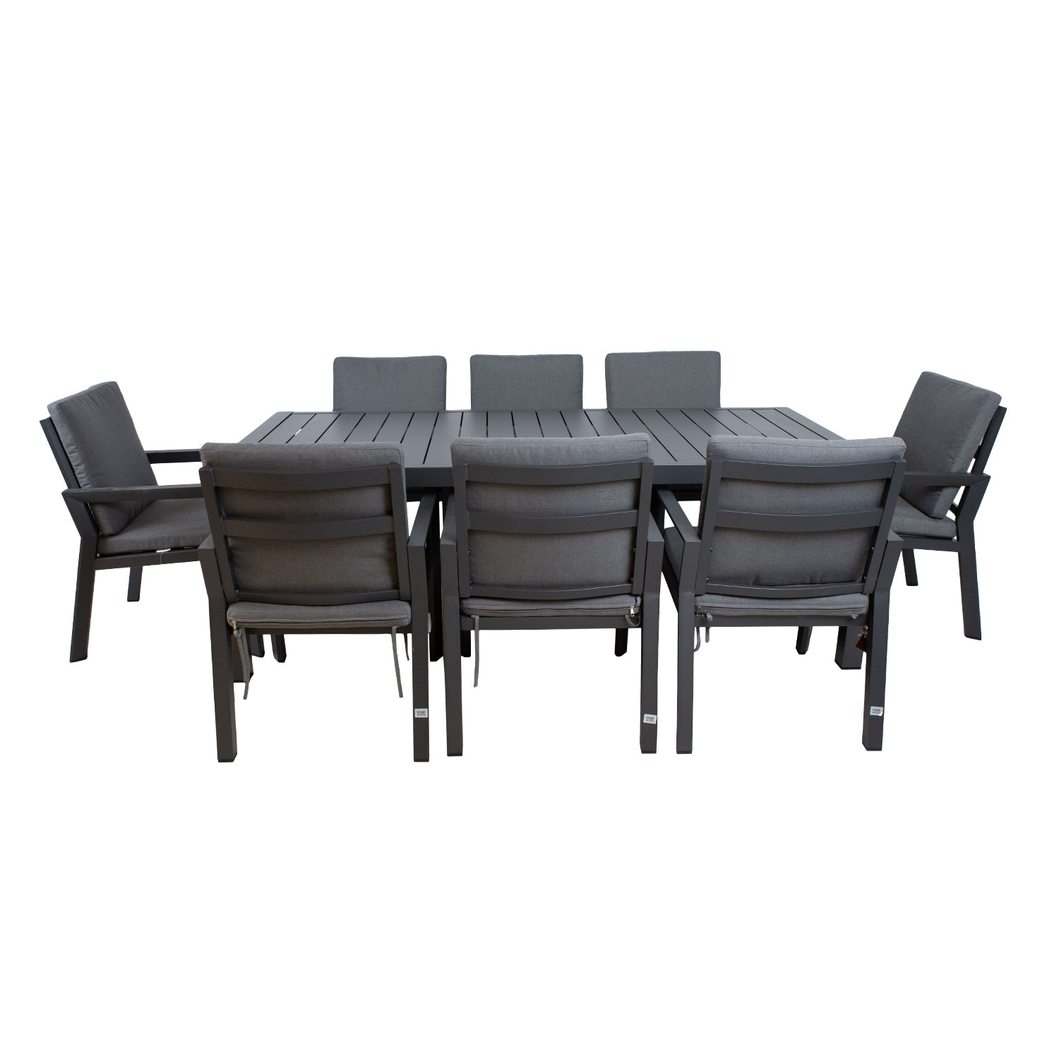 Lauaplaat ja jalad ning toolide jalad ja raam on valmistatud alumiiniumist ja viimistletud tumehalli pulbervärviga.