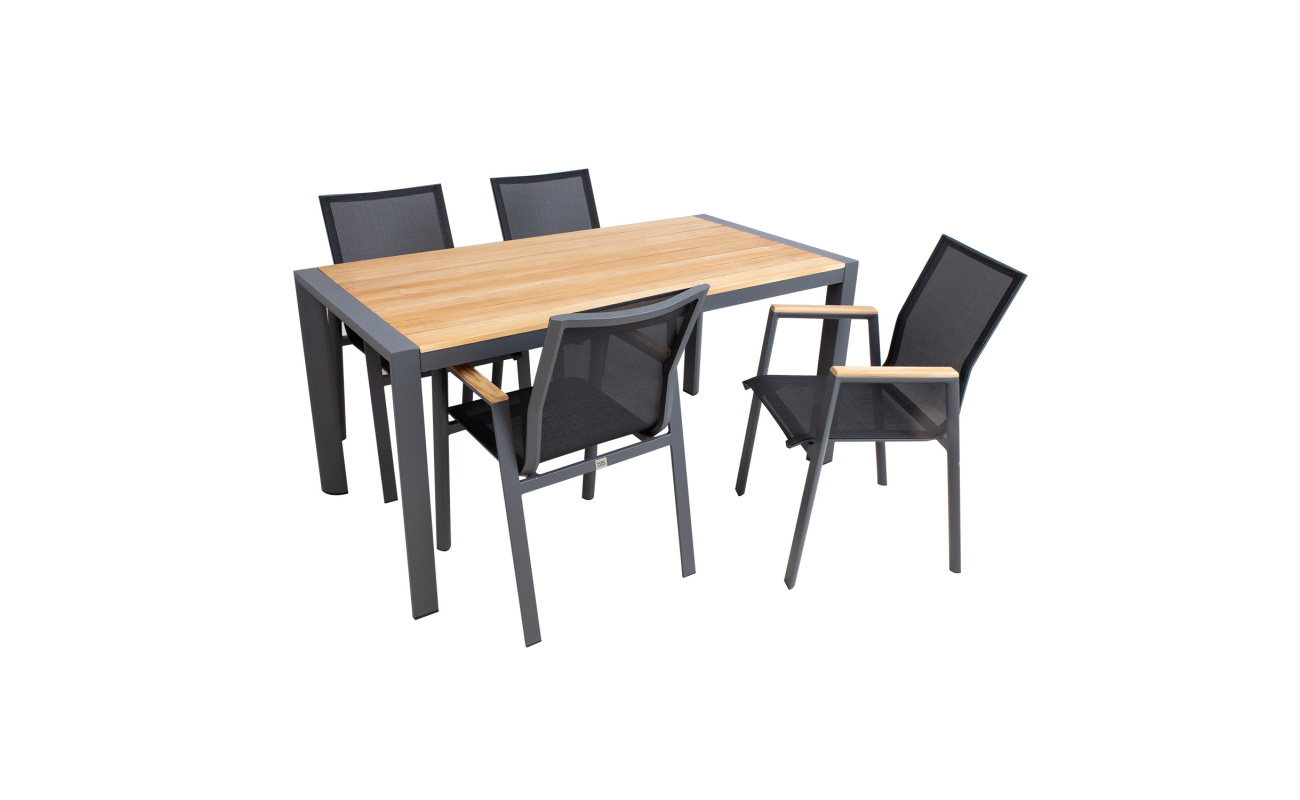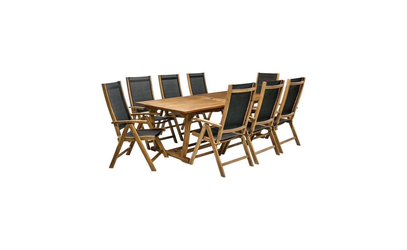 Söögilauakomplekt BALI laud ja 6 tooli. Laua mõõdud on 220x100xH75cm. Laud on valmistatud hoolikalt valitud küpsest tiikpuust. Puidu peenlihvitud pind on täielikult naturaalne. Tänu suurele looduslike õlide sisaldusele on tiikpuu väga vastupidav niiskuse ning puidukahjurite suhtes ning ei vaja täiendavat viimistlemist või õlitamist. Tooli üldmõõdud on 62x62xH91cm. Istme laius 46cm, istme sügavus 52cm, istme kõrgus 45cm. Seljatoe kõrgus 49cm. Käetugede kõrgus maast 68cm. Kaalupiirang 120kg. Toolid on virnastatavad. Tooli raam on valmistatud tiikpuust. Iste ja seljatugi on valmistatud valgest batylinest. Batyline materjali kõige olulisem omadus on selle nõtkus ja optimaalne istumismugavus. Lisaks erakordsele mehaanilisele tugevusele on materjalil kõrge keemiline vastupidavus. Sünteetiline kate tagab ülikõrge ilmastiku- ja UV-kindluse. Batyline ei ima niiskust, tänu sellele kuivab materjal väga kiiresti ja on maksimaalselt pleki- ja hallituskindel ning lihtsalt puhastatav. Tiikpuu talub väga hästi erinevaid ilmastikutingimusi ja säilitab oma suurepärase välimuse ja parimad omadused pikkadeks aastateks. Mida küpsem on puit, seda suurem on selle tihedus ja õli sisaldus ja seda vastupidavam ja stabiilsem on see ilmastikutingimuste suhtes. Päikesevalguse ja niiskuse mõjul muutub puidu pind aja jooksul kaunilt hõbehalliks. Selline värvimuutus on loomulik ning ei mõjuta puidu kvaliteeti. HOOLDUS: puhastage mööblit regulaarselt, kaitske liigniiskuse ja UV kiirguse eest. Puidust pindade värskendamiseks võib need soovikorral kergelt üle lihvida. Välitingimustes kasutatava mööbli eluea pikendamiseks soovitame kasutada välimööbli katteid. HOIUSTAMINE: suvehooaja lõppedes soovitame aiamööblit hoiustada siseruumides. Puhastage ja kuivatage mööbel enne hoiule panekut. Kasutage hoiustamiseks kuiva ning hea ventilatsiooniga ruumi.