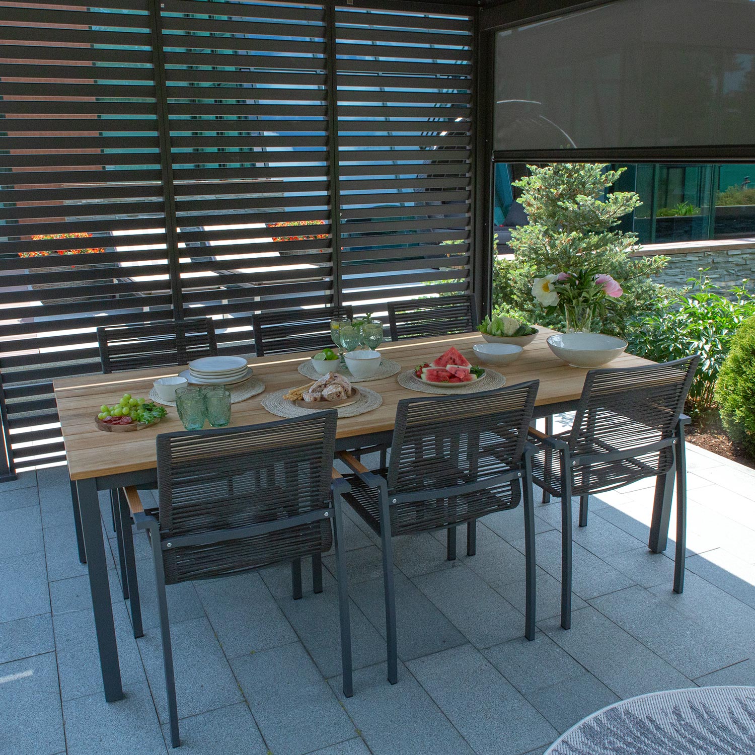 Lauaplaat on valmistatud A-klassi tiikpuust. Peenlihvitud pind on täielikult naturaalne oma looduslikus ilus ning seda ei ole õlitatud ega muul viisil keemiliselt töödeldud. Laua jalad ja alusraam on valmistatud roostevabast terasest ja viimistletud halli pulbervärviga. A-klassi tiikpuu on täiuslik looduslik materjal luksusliku õuemööbli valmistamiseks. Puidu süü on tihe ja ühtlane ning kauni sametise läikega, värvus on kuldse nisu-ja meetoonides.