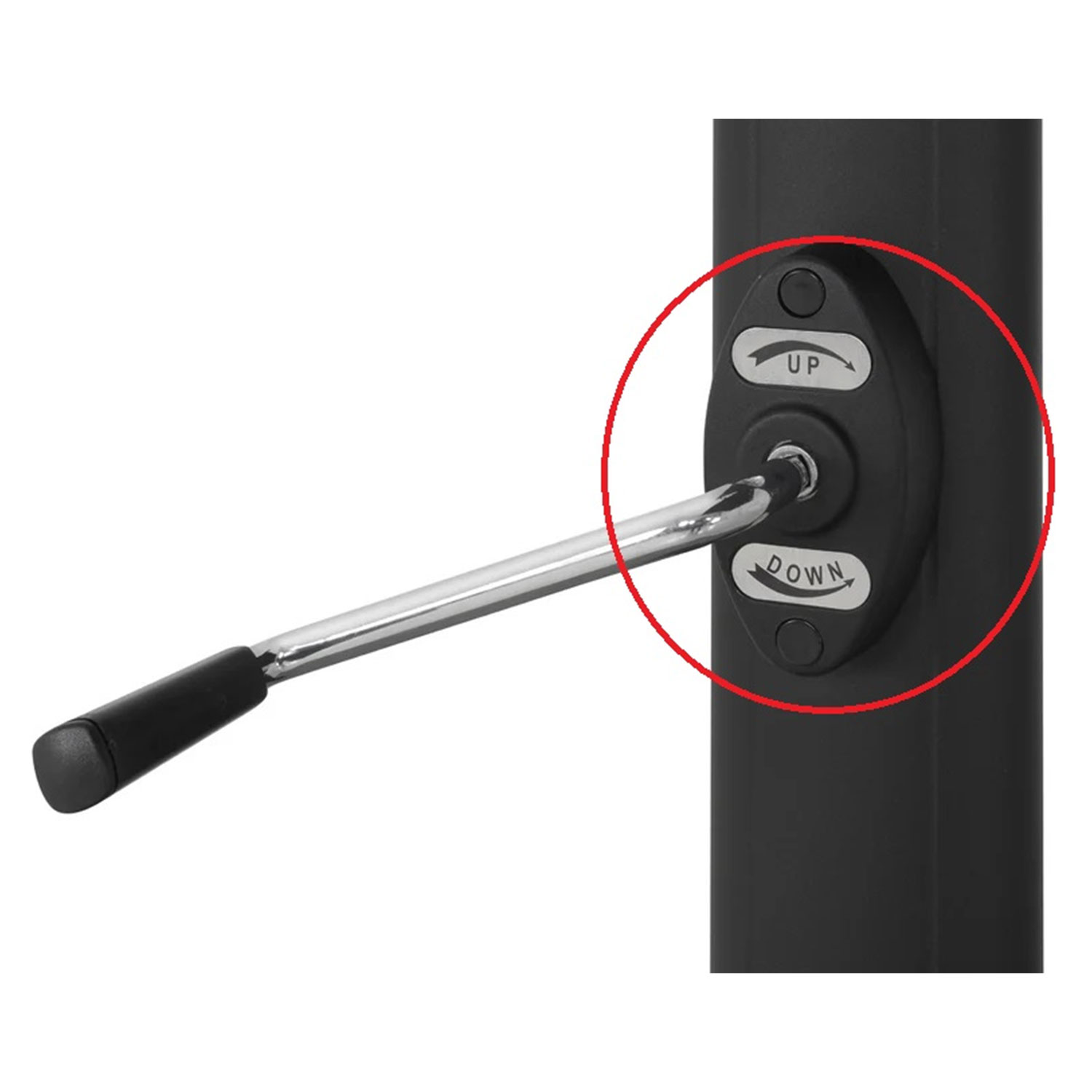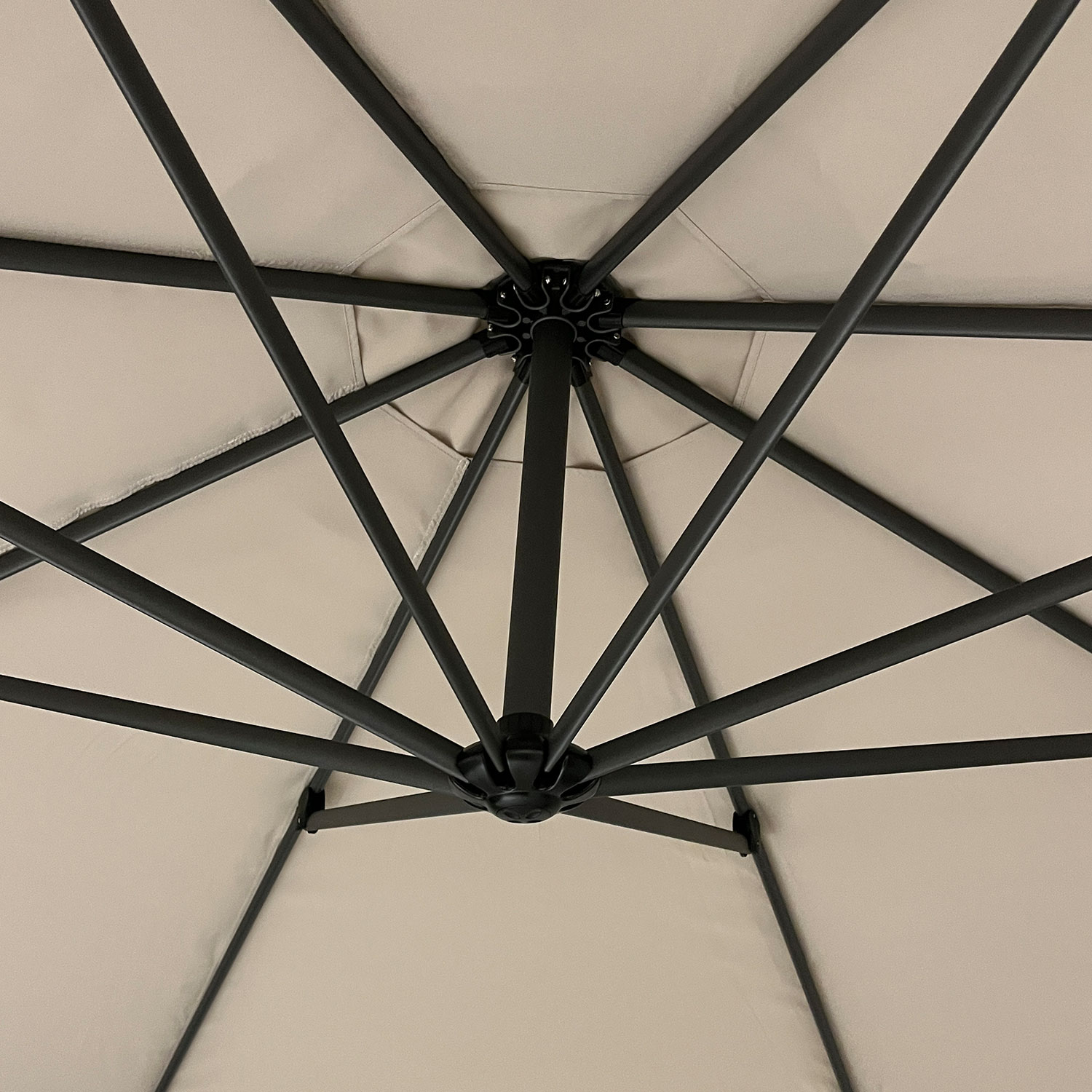 Päikesevarjul on tugev ja stabiilne alumiiniumjalg, mis on viimistletud halli pulbervärviga. Jalatoru mõõt on 90x51mm. Varjul on 8 alumiiniumribi 16x28mm.